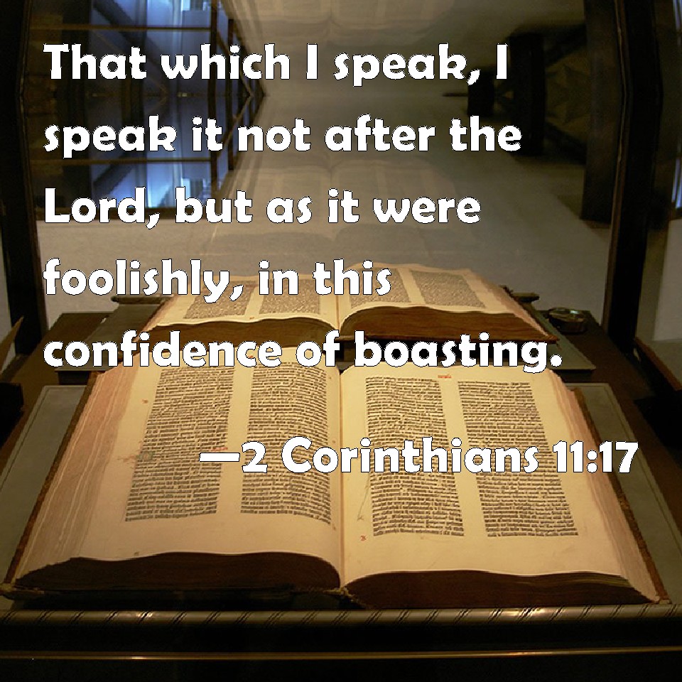 Choose a Background 2 Corinthians 11:17 That which I speak, I speak it not after the Lord, but as it were foolishly, in this confidence of boasting. KJV: That which I speak, I speak it not after the Lord, but as it were foolishly, in this confidence of boasting. DRB: That which I speak, I speak not according to God, but as it were in foolishness, in this matter of glorying. DBT: What I speak I do not speak according to the Lord, but as in folly, in this confidence of boasting. ERV: That which I speak, I speak not after the Lord, but as in foolishness, in this confidence of glorying. WBT: That which I speak, I speak it not according to the Lord, but as it were foolishly, in this confidence of boasting. WEB: That which I speak, I don't speak according to the Lord, but as in foolishness, in this confidence of boasting. YLT: That which I speak, I speak not according to the Lord, but as in foolishness, in this the confidence of boasting;Links 2 Corinthians 11:17 NIV • 2 Corinthians 11:17 NLT • 2 Corinthians 11:17 ESV • 2 Corinthians 11:17 NASB • 2 Corinthians 11:17 KJV • 2 Corinthians 11:17 Interlinear • 2 Corinthians 11:17 Commentaries • 2 Corinthians 11:17 Parallel Texts • 2 Corinthians 11:17 Bible Apps • 2 Corinthians 11:17 Parallel • Bible Hub |