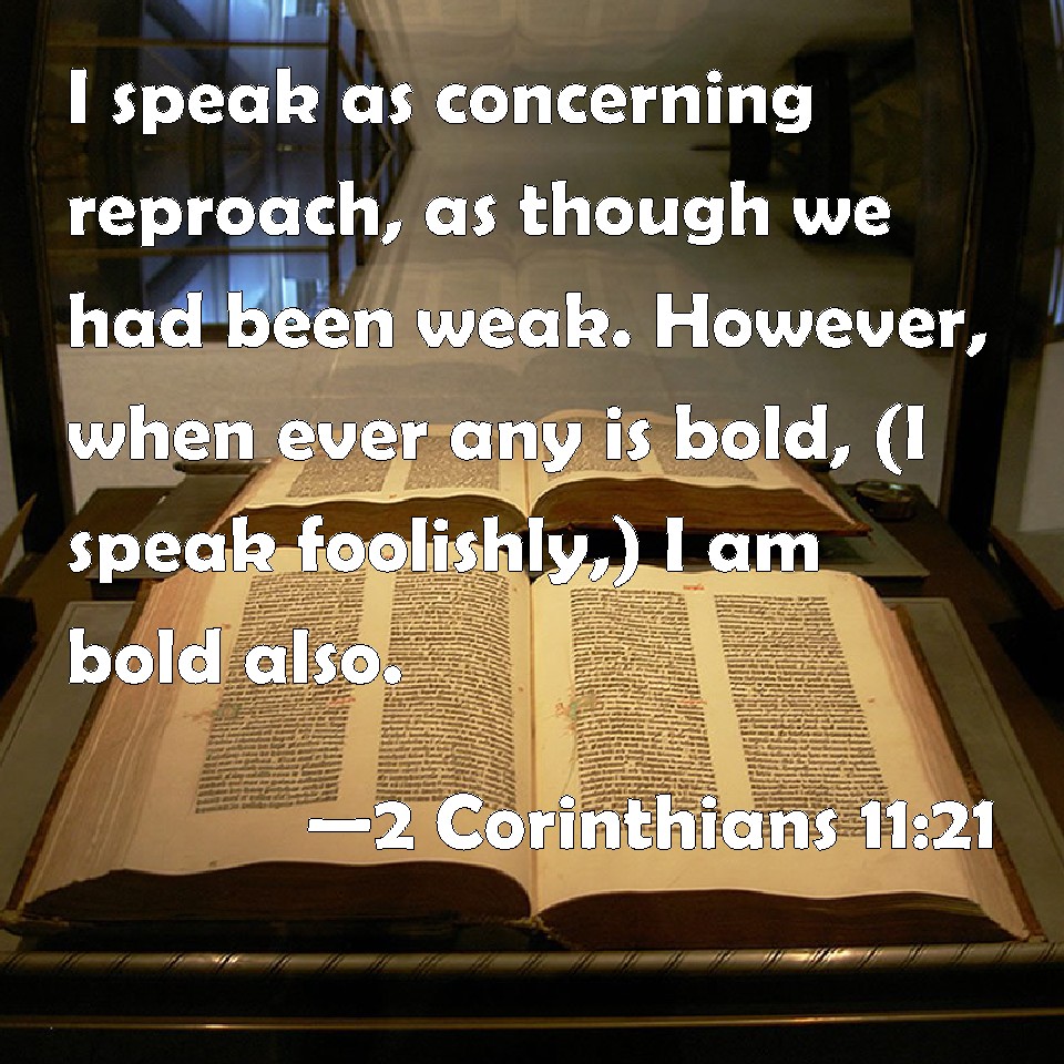 Choose a Background 2 Corinthians 11:21 I speak as concerning reproach, as though we had been weak. However, when ever any is bold, (I speak foolishly,) I am bold also. KJV: I speak as concerning reproach, as though we had been weak. Howbeit whereinsoever any is bold, (I speak foolishly,) I am bold also. DRB: I speak according to dishonour, as if we had been weak in this part. Wherein if any man dare (I speak foolishly), I dare also. DBT: I speak as to dishonour, as though we had been weak; but wherein any one is daring, (I speak in folly,) I also am daring. ERV: I speak by way of disparagement, as though we had been weak. Yet whereinsoever any is bold (I speak in foolishness), I am bold also. WBT: I speak as concerning reproach, as though we had been weak. But in whatever respect any is bold, (I speak foolishly) I am bold also. WEB: I speak by way of disparagement, as though we had been weak. Yet however any is bold (I speak in foolishness), I am bold also. YLT: in reference to dishonour I speak, how that we were weak, and in whatever any one is bold — in foolishness I say it — I also am bold.Links 2 Corinthians 11:21 NIV • 2 Corinthians 11:21 NLT • 2 Corinthians 11:21 ESV • 2 Corinthians 11:21 NASB • 2 Corinthians 11:21 KJV • 2 Corinthians 11:21 Interlinear • 2 Corinthians 11:21 Commentaries • 2 Corinthians 11:21 Parallel Texts • 2 Corinthians 11:21 Bible Apps • 2 Corinthians 11:21 Parallel • Bible Hub |