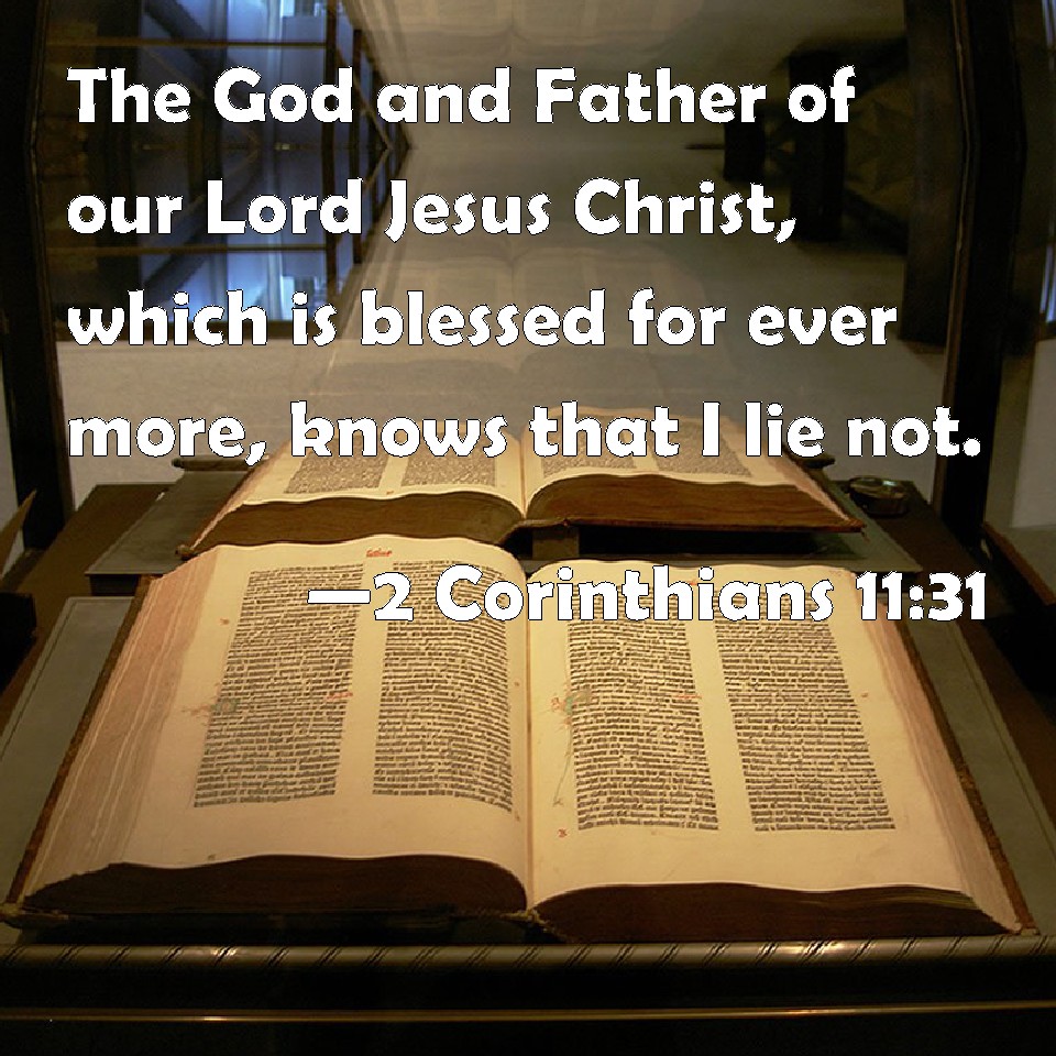 Choose a Background 2 Corinthians 11:31 The God and Father of our Lord Jesus Christ, which is blessed for ever more, knows that I lie not. KJV: The God and Father of our Lord Jesus Christ, which is blessed for evermore, knoweth that I lie not. DRB: The God and Father of our Lord Jesus Christ, who is blessed for ever, knoweth that I lie not. DBT: The God and Father of the Lord Jesus knows he who is blessed for ever that I do not lie. ERV: The God and Father of the Lord Jesus, he who is blessed for evermore, knoweth that I lie not. WBT: The God and Father of our Lord Jesus Christ, who is blessed for evermore, knoweth that I lie not. WEB: The God and Father of the Lord Jesus Christ, he who is blessed forevermore, knows that I don't lie. YLT: the God and Father of our Lord Jesus Christ — who is blessed to the ages — hath known that I do not lie! — Links 2 Corinthians 11:31 NIV • 2 Corinthians 11:31 NLT • 2 Corinthians 11:31 ESV • 2 Corinthians 11:31 NASB • 2 Corinthians 11:31 KJV • 2 Corinthians 11:31 Interlinear • 2 Corinthians 11:31 Commentaries • 2 Corinthians 11:31 Parallel Texts • 2 Corinthians 11:31 Bible Apps • 2 Corinthians 11:31 Parallel • Bible Hub |