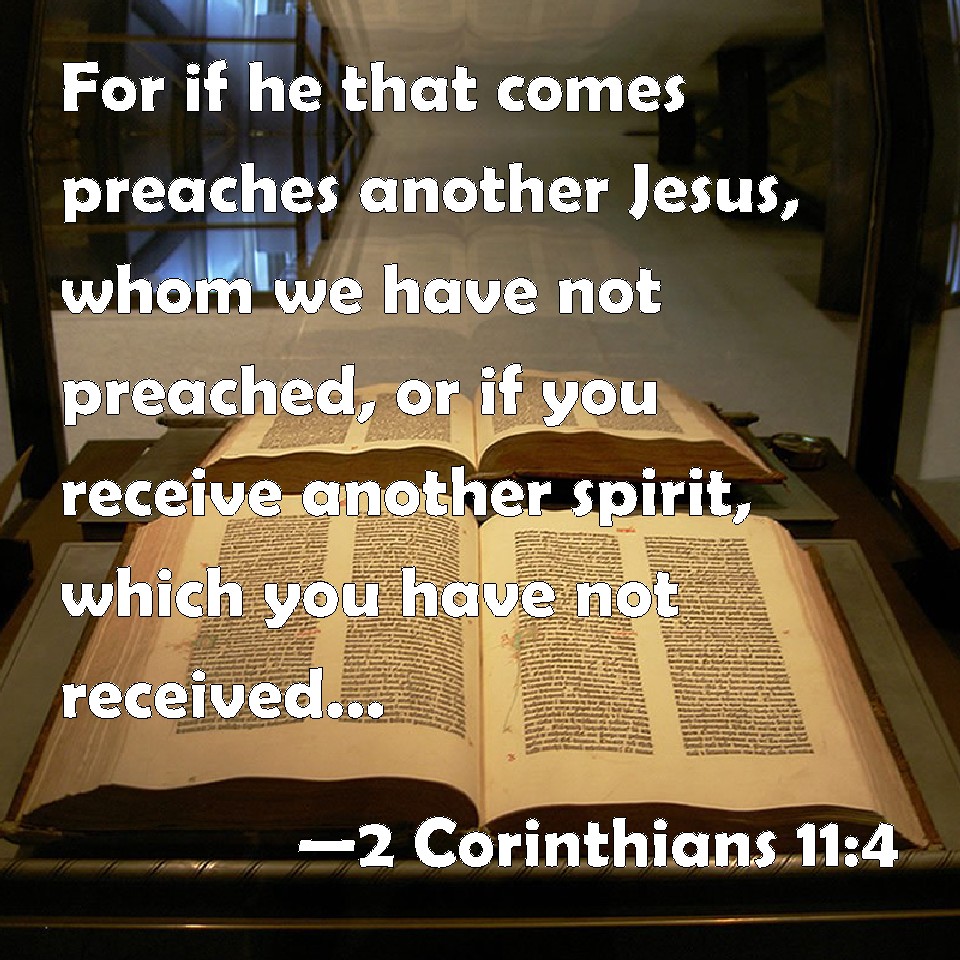 Choose a Background 2 Corinthians 11:4 For if he that comes preaches another Jesus, whom we have not preached, or if you receive another spirit, which you have not received, or another gospel, which you have not accepted, you might well bear with him. KJV: For if he that cometh preacheth another Jesus, whom we have not preached, or if ye receive another spirit, which ye have not received, or another gospel, which ye have not accepted, ye might well bear with him. DRB: For if he that cometh preacheth another Christ, whom we have not preached; or if you receive another Spirit, whom you have not received; or another gospel which you have not received; you might well bear with him. DBT: For if indeed he that comes preaches another Jesus, whom we have not preached, or ye get a different Spirit, which ye have not got, or a different glad tidings, which ye have not received, ye might well bear with it. ERV: For if he that cometh preacheth another Jesus, whom we did not preach, or if ye receive a different spirit, which ye did not receive, or a different gospel, which ye did not accept, ye do well to bear with him. WBT: For if he that cometh preacheth another Jesus, whom we have not preached, or if ye receive another spirit, which ye have not received, or another gospel, which ye have not accepted, ye might well bear with him. WEB: For if he who comes preaches another Jesus, whom we did not preach, or if you receive a different spirit, which you did not receive, or a different "good news", which you did not accept, you put up with that well enough. YLT: for if, indeed, he who is coming doth preach another Jesus whom we did not preach, or another Spirit ye receive which ye did not receive, or other good news which ye did not accept — well were ye bearing it,Links 2 Corinthians 11:4 NIV • 2 Corinthians 11:4 NLT • 2 Corinthians 11:4 ESV • 2 Corinthians 11:4 NASB • 2 Corinthians 11:4 KJV • 2 Corinthians 11:4 Interlinear • 2 Corinthians 11:4 Commentaries • 2 Corinthians 11:4 Parallel Texts • 2 Corinthians 11:4 Bible Apps • 2 Corinthians 11:4 Parallel • Bible Hub |