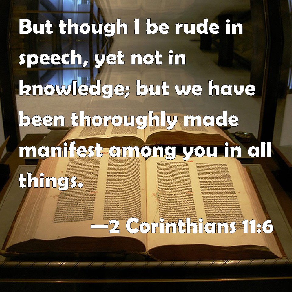 Choose a Background 2 Corinthians 11:6 But though I be rude in speech, yet not in knowledge; but we have been thoroughly made manifest among you in all things. KJV: But though I be rude in speech, yet not in knowledge; but we have been throughly made manifest among you in all things. DRB: For although I be rude in speech, yet not in knowledge; but in all things we have been made manifest to you. DBT: But if I am a simple person in speech, yet not in knowledge, but in everything making the truth manifest in all things to you. ERV: But though I be rude in speech, yet am I not in knowledge; nay, in everything we have made it manifest among all men to you-ward. WBT: But though I am rude in speech, yet not in knowledge; but we have been thoroughly made manifest among you in all things. WEB: But though I am unskilled in speech, yet I am not unskilled in knowledge. No, in every way we have been revealed to you in all things. YLT: and even if unlearned in word — yet not in knowledge, but in every thing we were made manifest in all things to you.Links 2 Corinthians 11:6 NIV • 2 Corinthians 11:6 NLT • 2 Corinthians 11:6 ESV • 2 Corinthians 11:6 NASB • 2 Corinthians 11:6 KJV • 2 Corinthians 11:6 Interlinear • 2 Corinthians 11:6 Commentaries • 2 Corinthians 11:6 Parallel Texts • 2 Corinthians 11:6 Bible Apps • 2 Corinthians 11:6 Parallel • Bible Hub |