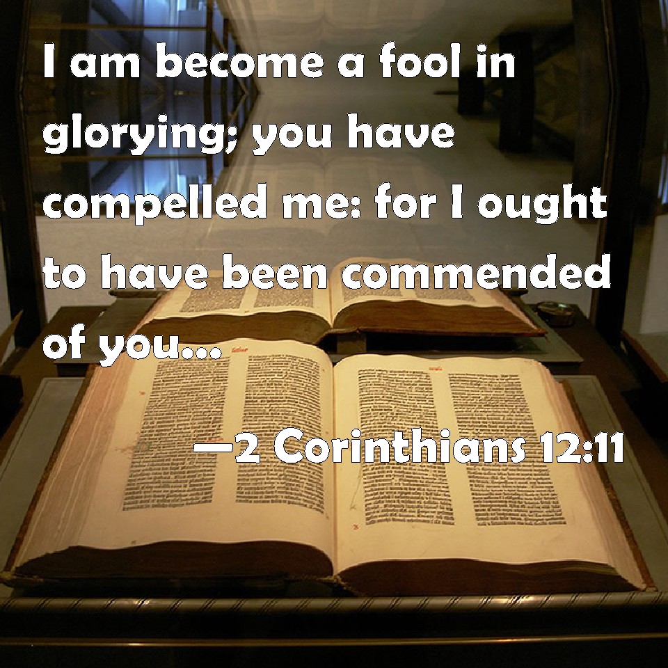 Choose a Background 2 Corinthians 12:11 I am become a fool in glorying; you have compelled me: for I ought to have been commended of you: for in nothing am I behind the very most chief apostles, though I be nothing. KJV: I am become a fool in glorying; ye have compelled me: for I ought to have been commended of you: for in nothing am I behind the very chiefest apostles, though I be nothing. DRB: I am become foolish: you have compelled me. For I ought to have been commended by you: for I have no way come short of them that are above measure apostles, although I be nothing. DBT: I have become a fool; ye have compelled me; for I ought to have been commended by you; for I have been nothing behind those who were in surpassing degree apostles, if also I am nothing. ERV: I am become foolish: ye compelled me; for I ought to have been commended of you: for in nothing was I behind the very chiefest apostles, though I am nothing. WBT: I am become a fool in glorying; ye have compelled me: for I ought to have been commended by you: for in nothing am I behind the very greatest apostles, though I am nothing. WEB: I have become foolish in boasting. You compelled me, for I ought to have been commended by you, for in nothing was I inferior to the very best apostles, though I am nothing. YLT: I have become a fool — boasting; ye — ye did compel me; for I ought by you to have been commended, for in nothing was I behind the very chiefest apostles — even if I am nothing.Links 2 Corinthians 12:11 NIV • 2 Corinthians 12:11 NLT • 2 Corinthians 12:11 ESV • 2 Corinthians 12:11 NASB • 2 Corinthians 12:11 KJV • 2 Corinthians 12:11 Interlinear • 2 Corinthians 12:11 Commentaries • 2 Corinthians 12:11 Parallel Texts • 2 Corinthians 12:11 Bible Apps • 2 Corinthians 12:11 Parallel • Bible Hub |