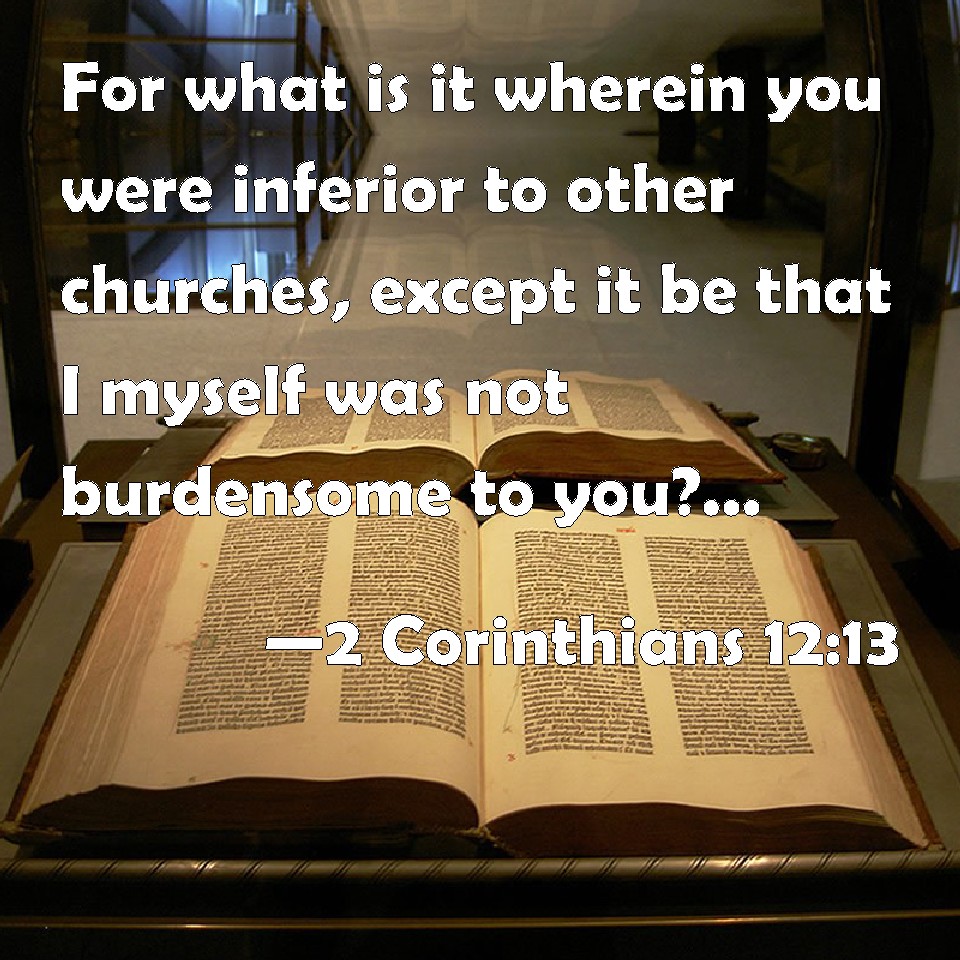 2 Corinthians 12:13 For what is it wherein you were inferior to other churches, except it be that I myself was not burdensome to you? forgive me this wrong.