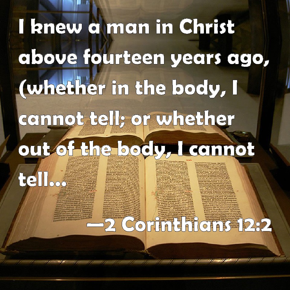 Choose a Background 2 Corinthians 12:2 I knew a man in Christ above fourteen years ago, (whether in the body, I cannot tell; or whether out of the body, I cannot tell: God knows;) such an one caught up to the third heaven. KJV: I knew a man in Christ above fourteen years ago, (whether in the body, I cannot tell; or whether out of the body, I cannot tell: God knoweth;) such an one caught up to the third heaven. DRB: I know a man in Christ above fourteen years ago (whether in the body, I know not, or out of the body, I know not; God knoweth), such a one caught up to the third heaven. DBT: I know a man in Christ, fourteen years ago, (whether in the body I know not, or out of the body I know not, God knows;) such a one caught up to the third heaven. ERV: I know a man in Christ, fourteen years ago (whether in the body, I know not; or whether out of the body, I know not; God knoweth), such a one caught up even to the third heaven. WBT: I knew a man in Christ above fourteen years ago, (whether in the body, I cannot tell; or whether out of the body, I cannot tell: God knoweth;) such one caught up to the third heaven. WEB: I know a man in Christ, fourteen years ago (whether in the body, I don't know, or whether out of the body, I don't know; God knows), such a one caught up into the third heaven. YLT: I have known a man in Christ, fourteen years ago — whether in the body I have not known, whether out of the body I have not known, God hath known — such an one being caught away unto the third heaven;Links 2 Corinthians 12:2 NIV • 2 Corinthians 12:2 NLT • 2 Corinthians 12:2 ESV • 2 Corinthians 12:2 NASB • 2 Corinthians 12:2 KJV • 2 Corinthians 12:2 Interlinear • 2 Corinthians 12:2 Commentaries • 2 Corinthians 12:2 Parallel Texts • 2 Corinthians 12:2 Bible Apps • 2 Corinthians 12:2 Parallel • Bible Hub |
