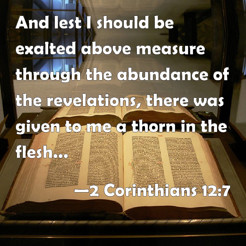 Choose a Background 2 Corinthians 12:7 And lest I should be exalted above measure through the abundance of the revelations, there was given to me a thorn in the flesh, the messenger of Satan to buffet me, lest I should be exalted above measure. KJV: And lest I should be exalted above measure through the abundance of the revelations, there was given to me a thorn in the flesh, the messenger of Satan to buffet me, lest I should be exalted above measure. DRB: And lest the greatness of the revelations should exalt me, there was given me a sting of my flesh, an angel of Satan, to buffet me. DBT: And that I might not be exalted by the exceeding greatness of the revelations, there was given to me a thorn for the flesh, a messenger of Satan that he might buffet me, that I might not be exalted. ERV: And by reason of the exceeding greatness of the revelations—wherefore, that I should not be exalted overmuch, there was given to me a thorn in the flesh, a messenger of Satan to buffet me, that I should not be exalted overmuch. WBT: And lest I should be exalted above measure through the abundance of the revelations, there was given to me a thorn in the flesh, the messenger of Satan to buffet me, lest I should be exalted above measure. WEB: By reason of the exceeding greatness of the revelations, that I should not be exalted excessively, there was given to me a thorn in the flesh, a messenger of Satan to torment me, that I should not be exalted excessively. YLT: and that by the exceeding greatness of the revelations I might not be exalted overmuch, there was given to me a thorn in the flesh, a messenger of the Adversary, that he might buffet me, that I might not be exalted overmuch.Links 2 Corinthians 12:7 NIV • 2 Corinthians 12:7 NLT • 2 Corinthians 12:7 ESV • 2 Corinthians 12:7 NASB • 2 Corinthians 12:7 KJV • 2 Corinthians 12:7 Interlinear • 2 Corinthians 12:7 Commentaries • 2 Corinthians 12:7 Parallel Texts • 2 Corinthians 12:7 Bible Apps • 2 Corinthians 12:7 Parallel • Bible Hub |