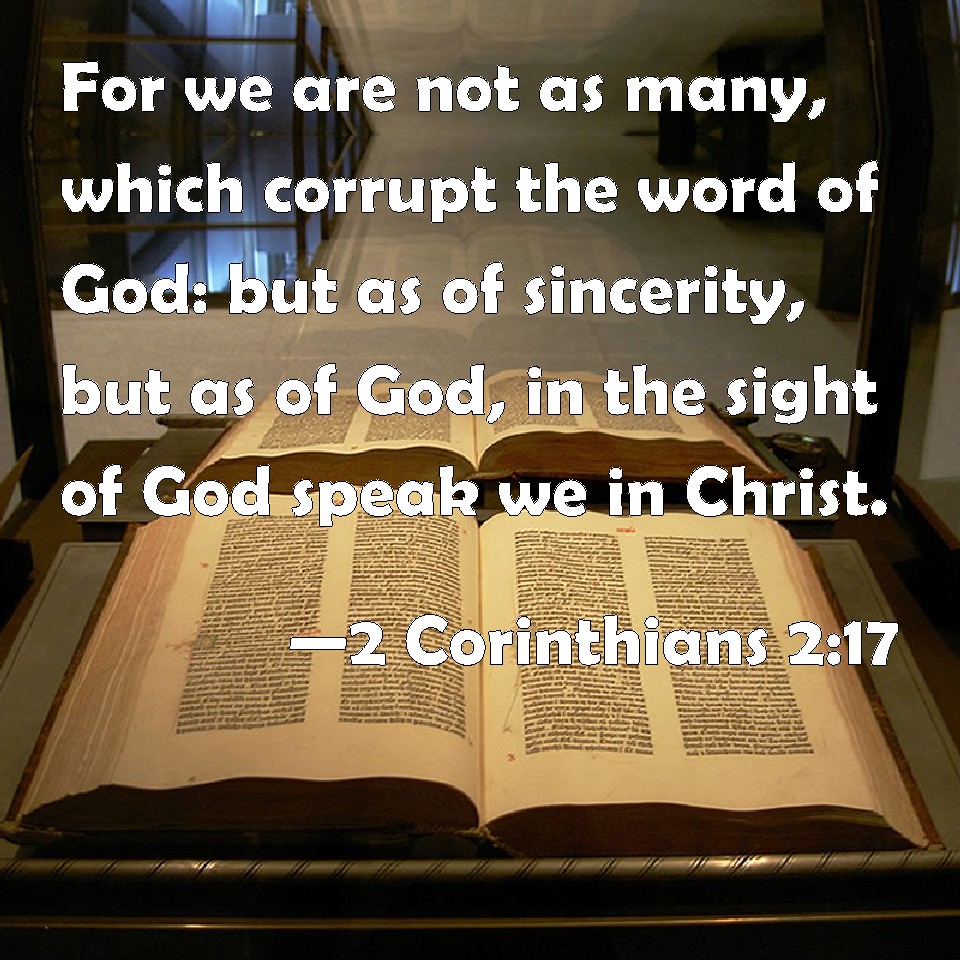 Choose a Background 2 Corinthians 2:17 For we are not as many, which corrupt the word of God: but as of sincerity, but as of God, in the sight of God speak we in Christ. KJV: For we are not as many, which corrupt the word of God: but as of sincerity, but as of God, in the sight of God speak we in Christ. DRB: For we are not as many, adulterating the word of God; but with sincerity, but as from God, before God, in Christ we speak. DBT: For we do not, as the many, make a trade of the word of God; but as of sincerity, but as of God, before God, we speak in Christ. ERV: For we are not as the many, corrupting the word of God: but as of sincerity, but as of God, in the sight of God, speak we in Christ. WBT: For we are not as many, who corrupt the word of God: but as from sincerity, but as from God, in the sight of God we speak in Christ. WEB: For we are not as so many, peddling the word of God. But as of sincerity, but as of God, in the sight of God, we speak in Christ. YLT: for we are not as the many, adulterating the word of God, but as of sincerity — but as of God; in the presence of God, in Christ we do speak.Links 2 Corinthians 2:17 NIV • 2 Corinthians 2:17 NLT • 2 Corinthians 2:17 ESV • 2 Corinthians 2:17 NASB • 2 Corinthians 2:17 KJV • 2 Corinthians 2:17 Interlinear • 2 Corinthians 2:17 Commentaries • 2 Corinthians 2:17 Parallel Texts • 2 Corinthians 2:17 Bible Apps • 2 Corinthians 2:17 Parallel • Bible Hub |
