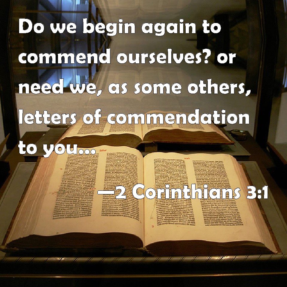 Choose a Background 2 Corinthians 3:1 Do we begin again to commend ourselves? or need we, as some others, letters of commendation to you, or letters of commendation from you? KJV: Do we begin again to commend ourselves? or need we, as some others, epistles of commendation to you, or letters of commendation from you? DRB: Do we begin again to commend ourselves? Or do we need (as some do) epistles of commendation to you, or from you? DBT: Do we begin again to commend ourselves? or do we need, as some, commendatory letters to you, or commendatory from you? ERV: Are we beginning again to commend ourselves? or need we, as do some, epistles of commendation to you or from you? WBT: Do we begin again to commend ourselves? or need we, as some others, epistles of commendation to you, or letters of commendation from you. WEB: Are we beginning again to commend ourselves? Or do we need, as do some, letters of commendation to you or from you? YLT: Do we begin again to recommend ourselves, except we need, as some, letters of recommendation unto you, or from you?Links 2 Corinthians 3:1 NIV • 2 Corinthians 3:1 NLT • 2 Corinthians 3:1 ESV • 2 Corinthians 3:1 NASB • 2 Corinthians 3:1 KJV • 2 Corinthians 3:1 Interlinear • 2 Corinthians 3:1 Commentaries • 2 Corinthians 3:1 Parallel Texts • 2 Corinthians 3:1 Bible Apps • 2 Corinthians 3:1 Parallel • Bible Hub |