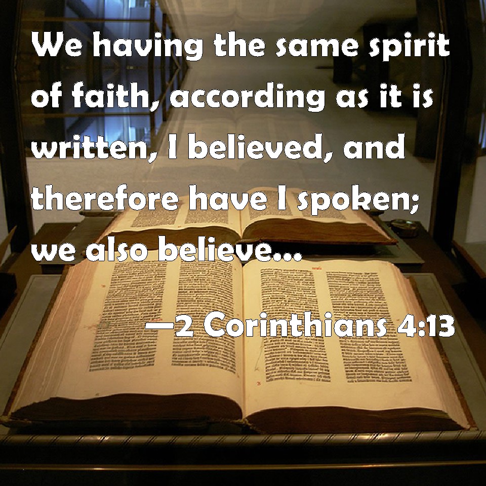 Choose a Background 2 Corinthians 4:13 We having the same spirit of faith, according as it is written, I believed, and therefore have I spoken; we also believe, and therefore speak; KJV: We having the same spirit of faith, according as it is written, I believed, and therefore have I spoken; we also believe, and therefore speak; DRB: But having the same spirit of faith, as it is written: I believed, for which cause I have spoken; we also believe, for which cause we speak also: DBT: And having the same spirit of faith, according to what is written, I have believed, therefore have I spoken; we also believe, therefore also we speak; ERV: But having the same spirit of faith, according to that which is written, I believed, and therefore did I speak; we also believe, and therefore also we speak; WBT: We having the same spirit of faith, according as it is written, I believed, and therefore have I spoken; we also believe, and therefore speak; WEB: But having the same spirit of faith, according to that which is written, "I believed, and therefore I spoke." We also believe, and therefore also we speak; YLT: And having the same spirit of the faith, according to that which hath been written, 'I believed, therefore I did speak;' we also do believe, therefore also do we speak;Links 2 Corinthians 4:13 NIV • 2 Corinthians 4:13 NLT • 2 Corinthians 4:13 ESV • 2 Corinthians 4:13 NASB • 2 Corinthians 4:13 KJV • 2 Corinthians 4:13 Interlinear • 2 Corinthians 4:13 Commentaries • 2 Corinthians 4:13 Parallel Texts • 2 Corinthians 4:13 Bible Apps • 2 Corinthians 4:13 Parallel • Bible Hub |