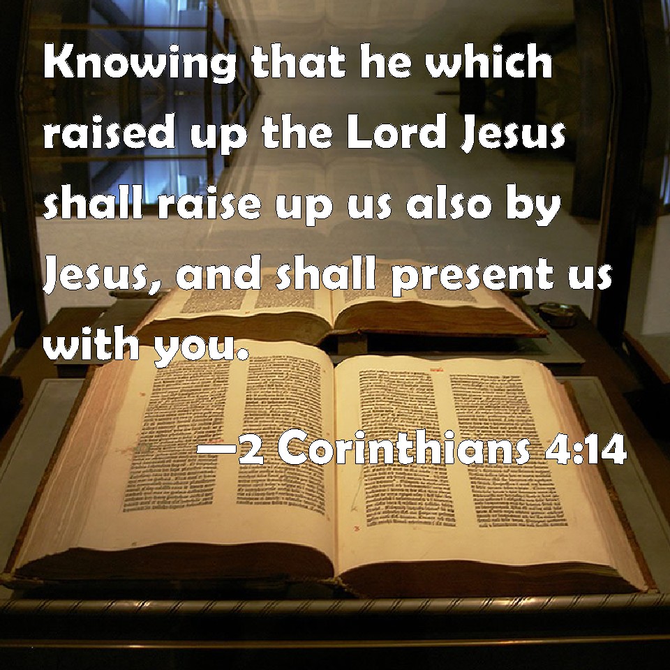 Choose a Background 2 Corinthians 4:14 Knowing that he which raised up the Lord Jesus shall raise up us also by Jesus, and shall present us with you. KJV: Knowing that he which raised up the Lord Jesus shall raise up us also by Jesus, and shall present us with you. DRB: Knowing that he who raised up Jesus, will raise us up also with Jesus, and place us with you. DBT: knowing that he who has raised the Lord Jesus shall raise us also with Jesus, and shall present us with you. ERV: knowing that he which raised up the Lord Jesus shall raise up us also with Jesus, and shall present us with you. WBT: Knowing, that he who raised the Lord Jesus, will raise us also by Jesus, and will present us with you. WEB: knowing that he who raised the Lord Jesus will raise us also with Jesus, and will present us with you. YLT: knowing that He who did raise up the Lord Jesus, us also through Jesus shall raise up, and shall present with you,Links 2 Corinthians 4:14 NIV • 2 Corinthians 4:14 NLT • 2 Corinthians 4:14 ESV • 2 Corinthians 4:14 NASB • 2 Corinthians 4:14 KJV • 2 Corinthians 4:14 Interlinear • 2 Corinthians 4:14 Commentaries • 2 Corinthians 4:14 Parallel Texts • 2 Corinthians 4:14 Bible Apps • 2 Corinthians 4:14 Parallel • Bible Hub |