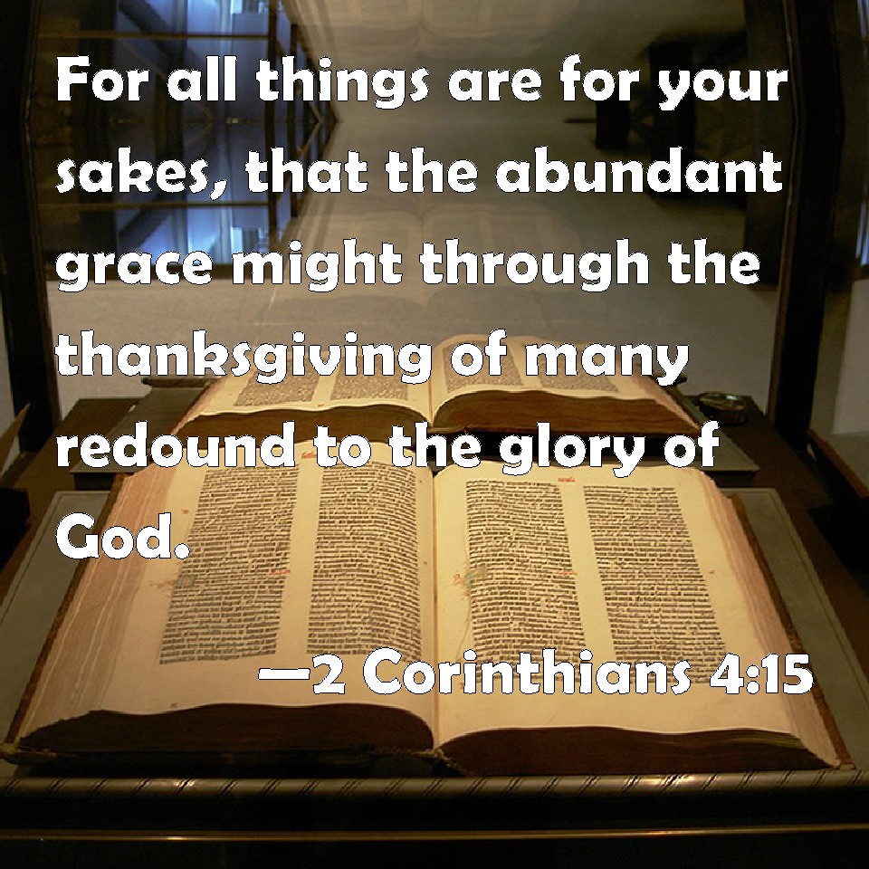Choose a Background 2 Corinthians 4:15 For all things are for your sakes, that the abundant grace might through the thanksgiving of many redound to the glory of God. KJV: For all things are for your sakes, that the abundant grace might through the thanksgiving of many redound to the glory of God. DRB: For all things are for your sakes; that the grace abounding through many, may abound in thanksgiving unto the glory of God. DBT: For all things are for your sakes, that the grace abounding through the many may cause thanksgiving to abound to the glory of God. ERV: For all things are for your sakes, that the grace, being multiplied through the many, may cause the thanksgiving to abound unto the glory of God. WBT: For all things are for your sakes, that the abundant grace may, through the thanksgiving of many, redound to the glory of God. WEB: For all things are for your sakes, that the grace, being multiplied through the many, may cause the thanksgiving to abound to the glory of God. YLT: for the all things are because of you, that the grace having been multiplied, because of the thanksgiving of the more, may abound to the glory of God;Links 2 Corinthians 4:15 NIV • 2 Corinthians 4:15 NLT • 2 Corinthians 4:15 ESV • 2 Corinthians 4:15 NASB • 2 Corinthians 4:15 KJV • 2 Corinthians 4:15 Interlinear • 2 Corinthians 4:15 Commentaries • 2 Corinthians 4:15 Parallel Texts • 2 Corinthians 4:15 Bible Apps • 2 Corinthians 4:15 Parallel • Bible Hub |