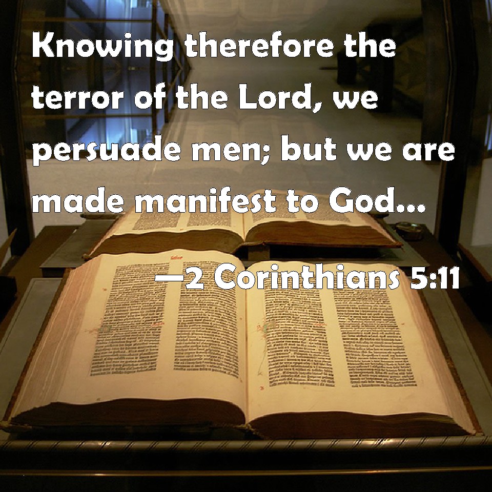 Choose a Background 2 Corinthians 5:11 Knowing therefore the terror of the Lord, we persuade men; but we are made manifest to God; and I trust also are made manifest in your consciences. KJV: Knowing therefore the terror of the Lord, we persuade men; but we are made manifest unto God; and I trust also are made manifest in your consciences. DRB: Knowing therefore the fear of the Lord, we use persuasion to men; but to God we are manifest. And I trust also that in your consciences we are manifest. DBT: Knowing therefore the terror of the Lord we persuade men, but have been manifested to God, and I hope also that we have been manifested in your consciences. ERV: Knowing therefore the fear of the Lord, we persuade men, but we are made manifest unto God; and I hope that we are made manifest also in your consciences. WBT: Knowing therefore the terror of the Lord, we persuade men; but we are made manifest to God; and I trust also are made manifest in your consciences. WEB: Knowing therefore the fear of the Lord, we persuade men, but we are revealed to God; and I hope that we are revealed also in your consciences. YLT: having known, therefore, the fear of the Lord, we persuade men, and to God we are manifested, and I hope also in your consciences to have been manifested;Links 2 Corinthians 5:11 NIV • 2 Corinthians 5:11 NLT • 2 Corinthians 5:11 ESV • 2 Corinthians 5:11 NASB • 2 Corinthians 5:11 KJV • 2 Corinthians 5:11 Interlinear • 2 Corinthians 5:11 Commentaries • 2 Corinthians 5:11 Parallel Texts • 2 Corinthians 5:11 Bible Apps • 2 Corinthians 5:11 Parallel • Bible Hub |