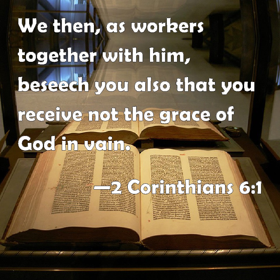 Choose a Background 2 Corinthians 6:1 We then, as workers together with him, beseech you also that you receive not the grace of God in vain. KJV: We then, as workers together with him, beseech you also that ye receive not the grace of God in vain. DRB: And we helping do exhort you, that you receive not the grace of God in vain. DBT: But as fellow-workmen, we also beseech that ye receive not the grace of God in vain: ERV: And working together with him we entreat also that ye receive not the grace of God in vain WBT: We then, as co-workers with him, beseech you also that ye receive not the grace of God in vain. WEB: Working together, we entreat also that you not receive the grace of God in vain, YLT: And working together also we call upon you that ye receive not in vain the grace of God — Links 2 Corinthians 6:1 NIV • 2 Corinthians 6:1 NLT • 2 Corinthians 6:1 ESV • 2 Corinthians 6:1 NASB • 2 Corinthians 6:1 KJV • 2 Corinthians 6:1 Interlinear • 2 Corinthians 6:1 Commentaries • 2 Corinthians 6:1 Parallel Texts • 2 Corinthians 6:1 Bible Apps • 2 Corinthians 6:1 Parallel • Bible Hub |