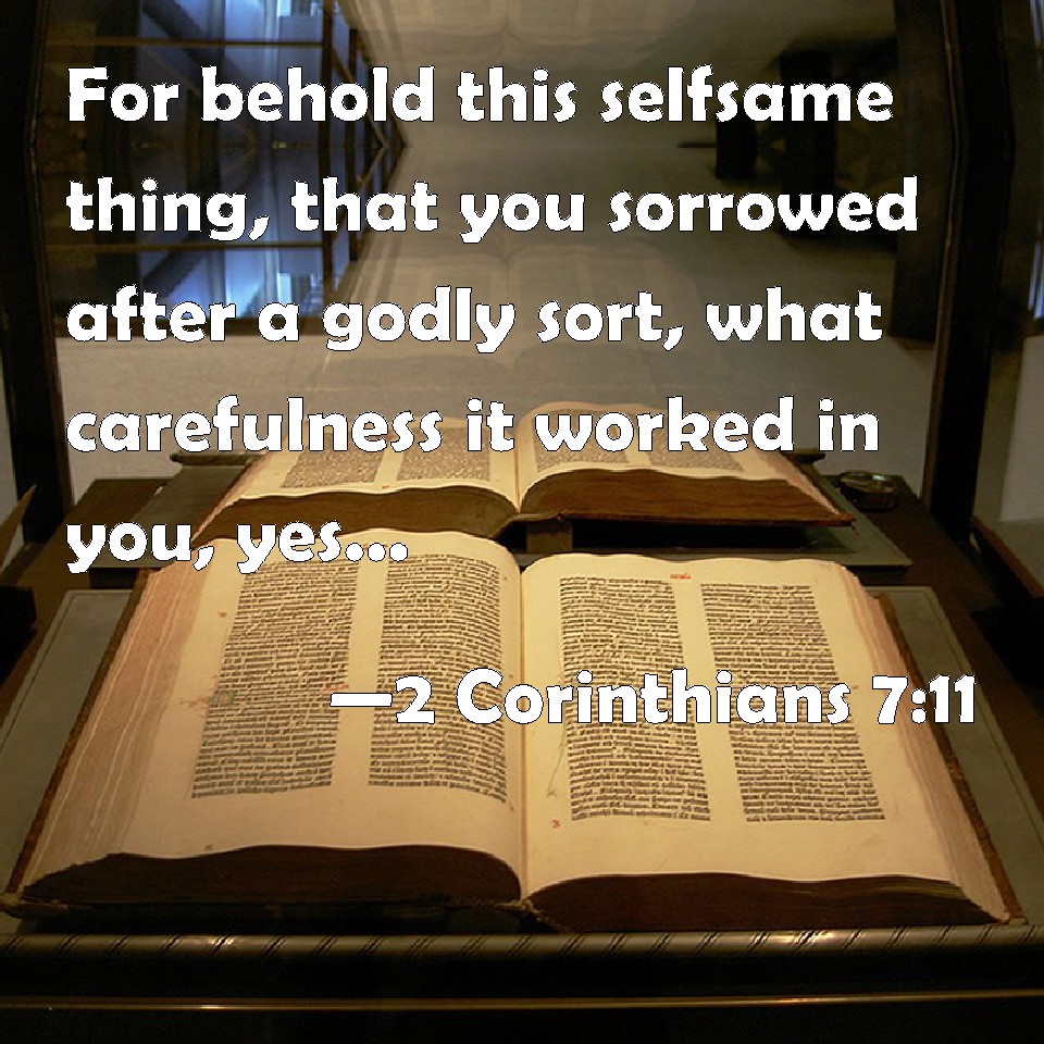 Choose a Background 2 Corinthians 7:11 For behold this selfsame thing, that you sorrowed after a godly sort, what carefulness it worked in you, yes, what clearing of yourselves, yes, what indignation, yes, what fear, yes, what vehement desire, yes, what zeal, yes, what revenge! In all things you have approved yourselves to be clear in this matter. KJV: For behold this selfsame thing, that ye sorrowed after a godly sort, what carefulness it wrought in you, yea, what clearing of yourselves, yea, what indignation, yea, what fear, yea, what vehement desire, yea, what zeal, yea, what revenge! In all things ye have approved yourselves to be clear in this matter. DRB: For behold this selfsame thing, that you were made sorrowful according to God, how great carefulness it worketh in you; yea defence, yea indignation, yea fear, yea desire, yea zeal, yea revenge: in all things you have shewed yourselves to be undefiled in the matter. DBT: For, behold, this same thing, your being grieved according to God, how much diligence it wrought in you, but what excusing of yourselves, but what indignation, but what fear, but what ardent desire, but what zeal, but what vengeance: in every way ye have proved yourselves to be pure in the matter. ERV: For behold, this selfsame thing, that ye were made sorry after a godly sort, what earnest care it wrought in you, yea, what clearing of yourselves, yea, what indignation, yea, what fear, yea, what longing, yea, what zeal, yea, what avenging! In everything ye approved yourselves to be pure in the matter. WBT: For behold this very thing, that ye sorrowed after a godly sort, what carefulness it wrought in you, yea, what clearing of yourselves, yea, what indignation, yea, what fear, yea, what vehement desire, yea, what zeal, yea, what avenging! In all things ye have approved yourselves to be clear in this matter. WEB: For behold, this same thing, that you were made sorry in a godly way, what earnest care it worked in you. Yes, what defense, indignation, fear, longing, zeal, and vengeance! In everything you demonstrated yourselves to be pure in the matter. YLT: for, lo, this same thing — your being made sorry toward God — how much diligence it doth work in you! but defence, but displeasure, but fear, but longing desire, but zeal, but revenge; in every thing ye did approve yourselves to be pure in the matter.Links 2 Corinthians 7:11 NIV • 2 Corinthians 7:11 NLT • 2 Corinthians 7:11 ESV • 2 Corinthians 7:11 NASB • 2 Corinthians 7:11 KJV • 2 Corinthians 7:11 Interlinear • 2 Corinthians 7:11 Commentaries • 2 Corinthians 7:11 Parallel Texts • 2 Corinthians 7:11 Bible Apps • 2 Corinthians 7:11 Parallel • Bible Hub |