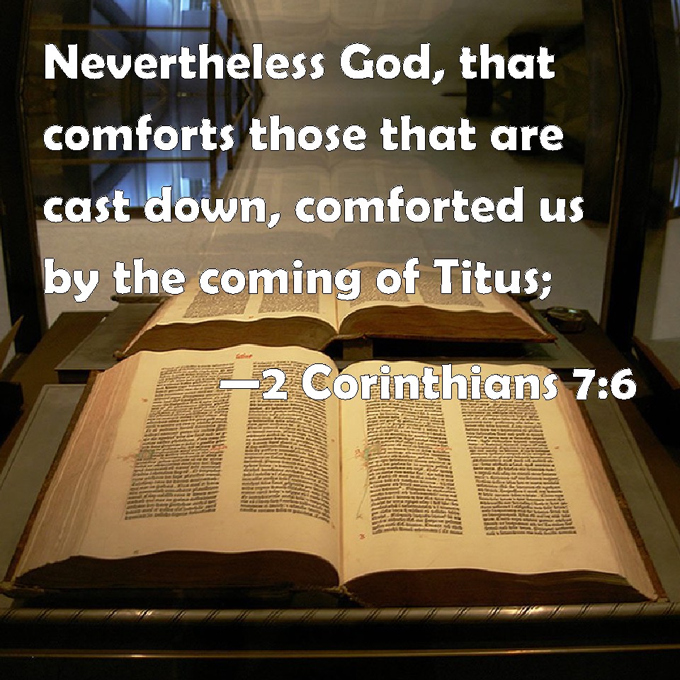 Choose a Background 2 Corinthians 7:6 Nevertheless God, that comforts those that are cast down, comforted us by the coming of Titus; KJV: Nevertheless God, that comforteth those that are cast down, comforted us by the coming of Titus; DRB: But God, who comforteth the humble, comforted us by the coming of Titus. DBT: But he who encourages those that are brought low, even God, encouraged us by the coming of Titus; ERV: Nevertheless he that comforteth the lowly, even God, comforted us by the coming of Titus; WBT: Nevertheless God, that comforteth those that are cast down, comforted us by the coming of Titus; WEB: Nevertheless, he who comforts the lowly, God, comforted us by the coming of Titus; YLT: but He who is comforting the cast-down — God — He did comfort us in the presence of Titus;Links 2 Corinthians 7:6 NIV • 2 Corinthians 7:6 NLT • 2 Corinthians 7:6 ESV • 2 Corinthians 7:6 NASB • 2 Corinthians 7:6 KJV • 2 Corinthians 7:6 Interlinear • 2 Corinthians 7:6 Commentaries • 2 Corinthians 7:6 Parallel Texts • 2 Corinthians 7:6 Bible Apps • 2 Corinthians 7:6 Parallel • Bible Hub |