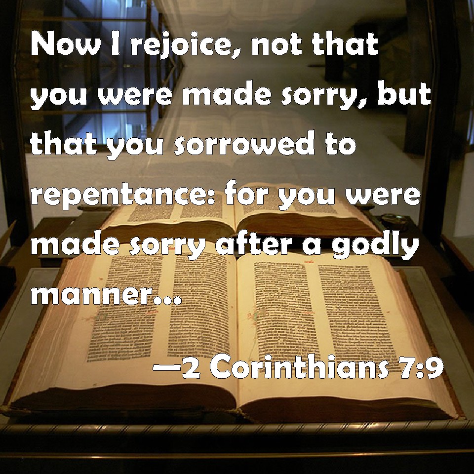 Choose a Background 2 Corinthians 7:9 Now I rejoice, not that you were made sorry, but that you sorrowed to repentance: for you were made sorry after a godly manner, that you might receive damage by us in nothing. KJV: Now I rejoice, not that ye were made sorry, but that ye sorrowed to repentance: for ye were made sorry after a godly manner, that ye might receive damage by us in nothing. DRB: Now I am glad: not because you were made sorrowful; but because you were made sorrowful unto penance. For you were made sorrowful according to God, that you might suffer damage by us in nothing. DBT: Now I rejoice, not that ye have been grieved, but that ye have been grieved to repentance; for ye have been grieved according to God, that in nothing ye might be injured by us. ERV: Now I rejoice, not that ye were made sorry, but that ye were made sorry unto repentance: for ye were made sorry after a godly sort, that ye might suffer loss by us in nothing. WBT: Now I rejoice, not that ye were made sorry, but that ye sorrowed to repentance: for ye were made sorry after a godly manner, that ye might receive damage by us in nothing. WEB: I now rejoice, not that you were made sorry, but that you were made sorry to repentance. For you were made sorry in a godly way, that you might suffer loss by us in nothing. YLT: I now do rejoice, not that ye were made sorry, but that ye were made sorry to reformation, for ye were made sorry toward God, that in nothing ye might receive damage from us;Links 2 Corinthians 7:9 NIV • 2 Corinthians 7:9 NLT • 2 Corinthians 7:9 ESV • 2 Corinthians 7:9 NASB • 2 Corinthians 7:9 KJV • 2 Corinthians 7:9 Interlinear • 2 Corinthians 7:9 Commentaries • 2 Corinthians 7:9 Parallel Texts • 2 Corinthians 7:9 Bible Apps • 2 Corinthians 7:9 Parallel • Bible Hub |