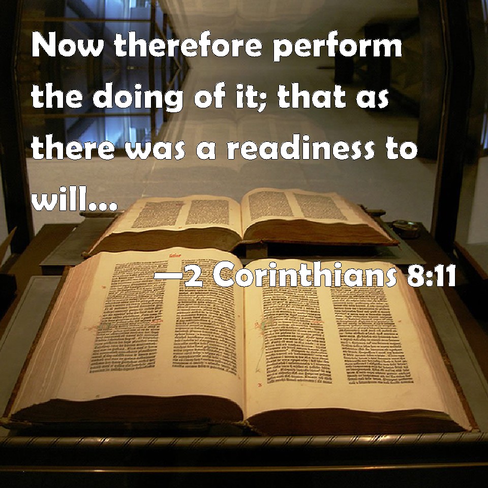 Choose a Background 2 Corinthians 8:11 Now therefore perform the doing of it; that as there was a readiness to will, so there may be a performance also out of that which you have. KJV: Now therefore perform the doing of it; that as there was a readiness to will, so there may be a performance also out of that which ye have. DRB: Now therefore perform ye it also in deed; that as your mind is forward to be willing, so it may be also to perform, out of that which you have. DBT: But now also complete the doing of it; so that as there was the readiness to be willing, so also to complete out of what ye have. ERV: But now complete the doing also; that as there was the readiness to will, so there may be the completion also out of your ability. WBT: Now therefore finish the doing of it; that as there was a readiness to will, so there may be a performance also out of that which ye have. WEB: But now complete the doing also, that as there was the readiness to be willing, so there may be the completion also out of your ability. YLT: and now also finish doing it, that even as there is the readiness of the will, so also the finishing, out of that which ye have,Links 2 Corinthians 8:11 NIV • 2 Corinthians 8:11 NLT • 2 Corinthians 8:11 ESV • 2 Corinthians 8:11 NASB • 2 Corinthians 8:11 KJV • 2 Corinthians 8:11 Interlinear • 2 Corinthians 8:11 Commentaries • 2 Corinthians 8:11 Parallel Texts • 2 Corinthians 8:11 Bible Apps • 2 Corinthians 8:11 Parallel • Bible Hub |