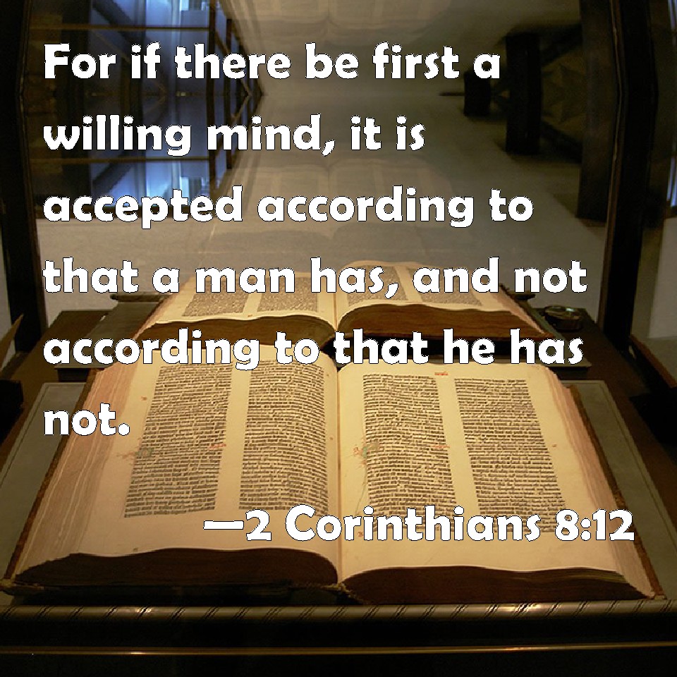 Choose a Background 2 Corinthians 8:12 For if there be first a willing mind, it is accepted according to that a man has, and not according to that he has not. KJV: For if there be first a willing mind, it is accepted according to that a man hath, and not according to that he hath not. DRB: For if the will be forward, it is accepted according to that which a man hath, not according to that which he hath not. DBT: For if the readiness be there, a man is accepted according to what he may have, not according to what he has not. ERV: For if the readiness is there, it is acceptable according as a man hath, not according as he hath not. WBT: For if there is first a willing mind, it is accepted according to what a man hath, and not according to what he hath not. WEB: For if the readiness is there, it is acceptable according to what you have, not according to what you don't have. YLT: for if the willing mind is present, according to that which any one may have it is well-accepted, not according to that which he hath not;Links 2 Corinthians 8:12 NIV • 2 Corinthians 8:12 NLT • 2 Corinthians 8:12 ESV • 2 Corinthians 8:12 NASB • 2 Corinthians 8:12 KJV • 2 Corinthians 8:12 Interlinear • 2 Corinthians 8:12 Commentaries • 2 Corinthians 8:12 Parallel Texts • 2 Corinthians 8:12 Bible Apps • 2 Corinthians 8:12 Parallel • Bible Hub |