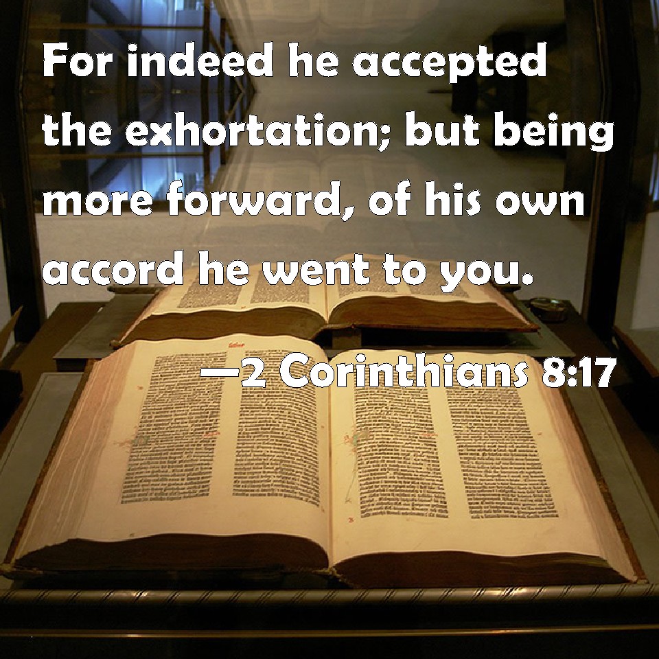 Choose a Background 2 Corinthians 8:17 For indeed he accepted the exhortation; but being more forward, of his own accord he went to you. KJV: For indeed he accepted the exhortation; but being more forward, of his own accord he went unto you. DRB: For indeed he accepted the exhortation; but being more careful, of his own will he went unto you. DBT: For he received indeed the entreaty, but, being full of zeal, he went of his own accord to you; ERV: For indeed he accepted our exhortation; but being himself very earnest, he went forth unto you of his own accord. WBT: For indeed he accepted the exhortation; but being more forward, of his own accord he went to you. WEB: For he indeed accepted our exhortation, but being himself very earnest, he went out to you of his own accord. YLT: because indeed the exhortation he accepted, and being more diligent, of his own accord he went forth unto you,Links 2 Corinthians 8:17 NIV • 2 Corinthians 8:17 NLT • 2 Corinthians 8:17 ESV • 2 Corinthians 8:17 NASB • 2 Corinthians 8:17 KJV • 2 Corinthians 8:17 Interlinear • 2 Corinthians 8:17 Commentaries • 2 Corinthians 8:17 Parallel Texts • 2 Corinthians 8:17 Bible Apps • 2 Corinthians 8:17 Parallel • Bible Hub |