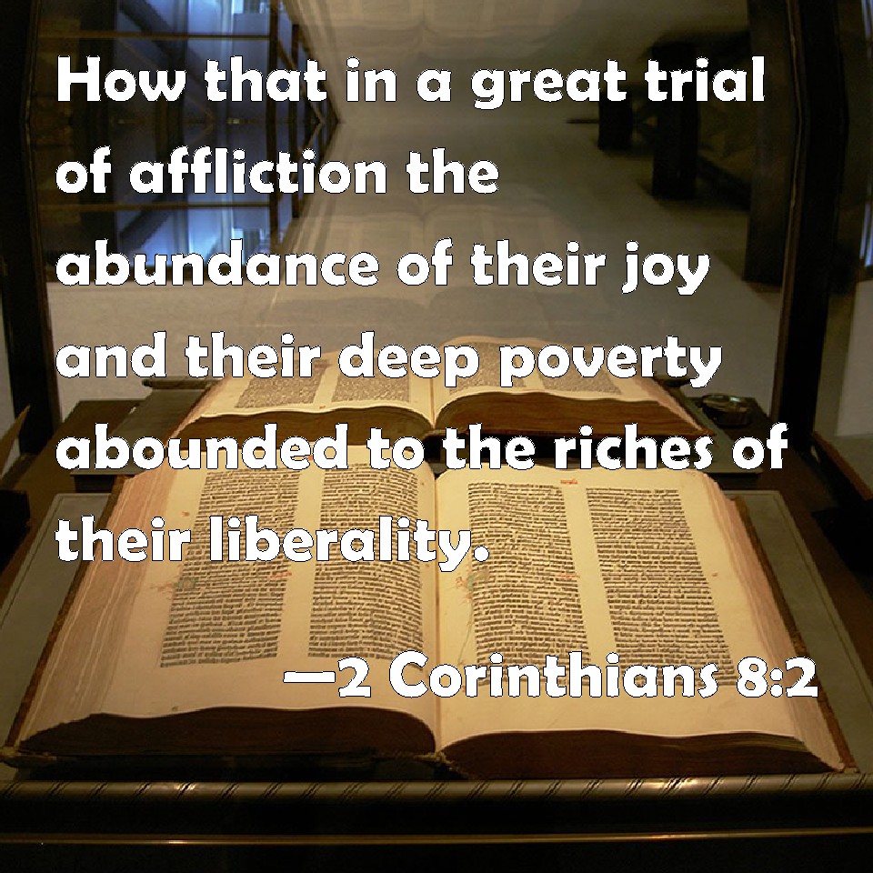 2 Corinthians 8:2 How that in a great trial of affliction the abundance of their joy and their deep poverty abounded to the riches of their liberality.