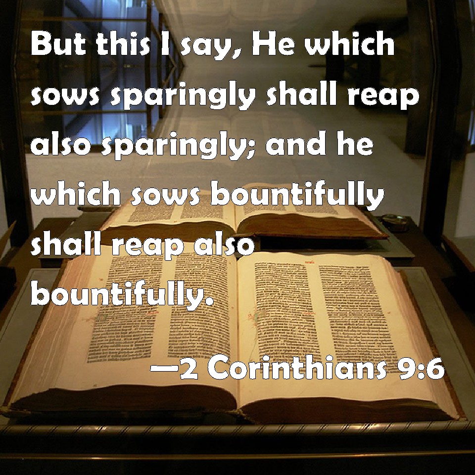 Choose a Background 2 Corinthians 9:6 But this I say, He which sows sparingly shall reap also sparingly; and he which sows bountifully shall reap also bountifully. KJV: But this I say, He which soweth sparingly shall reap also sparingly; and he which soweth bountifully shall reap also bountifully. DRB: Now this I say: He who soweth sparingly, shall also reap sparingly: and he who soweth in blessings, shall also reap blessings. DBT: But this is true, he that sows sparingly shall reap also sparingly; and he that sows in the spirit of blessing shall reap also in blessing: ERV: But this I say, He that soweth sparingly shall reap also sparingly; and he that soweth bountifully shall reap also bountifully. WBT: But this I say, He who soweth sparingly, shall reap also sparingly; and he who soweth bountifully, shall reap also bountifully. WEB: Remember this: he who sows sparingly will also reap sparingly. He who sows bountifully will also reap bountifully. YLT: And this: He who is sowing sparingly, sparingly also shall reap; and he who is sowing in blessings, in blessings also shall reap;Links 2 Corinthians 9:6 NIV • 2 Corinthians 9:6 NLT • 2 Corinthians 9:6 ESV • 2 Corinthians 9:6 NASB • 2 Corinthians 9:6 KJV • 2 Corinthians 9:6 Interlinear • 2 Corinthians 9:6 Commentaries • 2 Corinthians 9:6 Parallel Texts • 2 Corinthians 9:6 Bible Apps • 2 Corinthians 9:6 Parallel • Bible Hub |