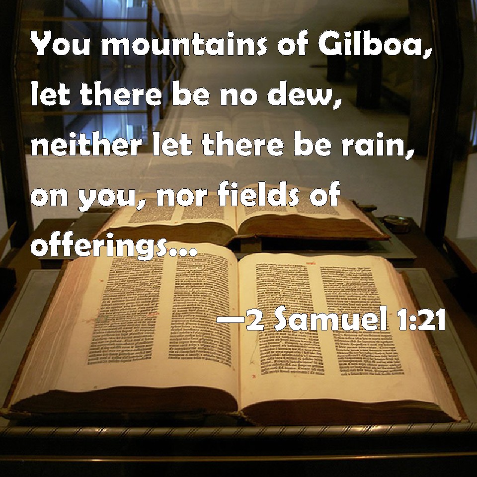 Choose a Background 2 Samuel 1:21 You mountains of Gilboa, let there be no dew, neither let there be rain, on you, nor fields of offerings: for there the shield of the mighty is vilely cast away, the shield of Saul, as though he had not been anointed with oil. KJV: Ye mountains of Gilboa, let there be no dew, neither let there be rain, upon you, nor fields of offerings: for there the shield of the mighty is vilely cast away, the shield of Saul, as though he had not been anointed with oil. DRB: Ye mountains of Gelboe, let neither dew, nor rain come upon you, neither be they fields of firstfruits: for there was cast away the shield of the valiant, the shield of Saul as though he had not been anointed with oil. DBT: Ye mountains of Gilboa, let there be no dew, no rain upon you, nor fields of heave-offerings! For there the shield of the mighty was vilely cast away, The shield of Saul, as not anointed with oil. ERV: Ye mountains of Gilboa, let there be no dew nor rain upon you, neither fields of offerings: for there the shield of the mighty was vilely cast away, the shield of Saul, not anointed with oil. WBT: Ye mountains of Gilboa, let there be no dew, neither rain upon you, nor fields of offerings: for there the shield of the mighty is vilely cast away, the shield of Saul, as though he had not been anointed with oil. WEB: You mountains of Gilboa, let there be no dew nor rain on you, neither fields of offerings; For there the shield of the mighty was vilely cast away, The shield of Saul was not anointed with oil. YLT: Mountains of Gilboa! No dew nor rain be on you, And fields of heave-offerings! For there hath become loathsome The shield of the mighty, The shield of Saul — without the anointed with oil.Links 2 Samuel 1:21 NIV • 2 Samuel 1:21 NLT • 2 Samuel 1:21 ESV • 2 Samuel 1:21 NASB • 2 Samuel 1:21 KJV • 2 Samuel 1:21 Interlinear • 2 Samuel 1:21 Commentaries • 2 Samuel 1:21 Parallel Texts • 2 Samuel 1:21 Bible Apps • 2 Samuel 1:21 Parallel • Bible Hub |