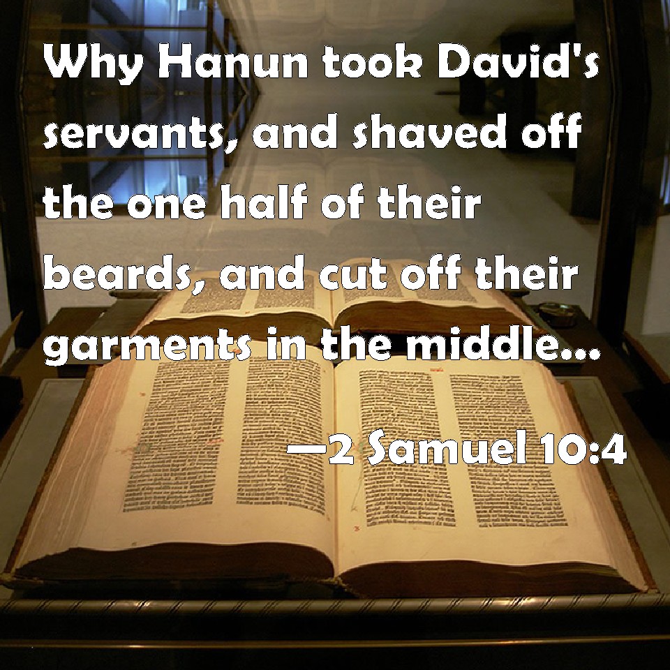 Choose a Background 2 Samuel 10:4 Why Hanun took David's servants, and shaved off the one half of their beards, and cut off their garments in the middle, even to their buttocks, and sent them away. KJV: Wherefore Hanun took David's servants, and shaved off the one half of their beards, and cut off their garments in the middle, even to their buttocks, and sent them away. DRB: Wherefore Hanon took the servants of David, and shaved off the one half of their beards, and cut away half of their garments even to the buttocks, and sent them away. DBT: And Hanun took David's servants, and had the one half of their beards shaved off, and their raiment cut off in the midst, as far as their buttocks, and sent them away. ERV: So Hanun took David's servants, and shaved off the one half of their beards, and cut off their garments in the middle, even to their buttocks, and sent them away. WBT: Wherefore Hanun took David's servants, and shaved off the one half of their beards, and cut off their garments in the middle, even to their buttocks, and sent them away. WEB: So Hanun took David's servants, and shaved off the one half of their beards, and cut off their garments in the middle, even to their buttocks, and sent them away. YLT: And Hanun taketh the servants of David, and shaveth off the half of their beard, and cutteth off their long robes in the midst — unto their buttocks, and sendeth them away;Links 2 Samuel 10:4 NIV • 2 Samuel 10:4 NLT • 2 Samuel 10:4 ESV • 2 Samuel 10:4 NASB • 2 Samuel 10:4 KJV • 2 Samuel 10:4 Interlinear • 2 Samuel 10:4 Commentaries • 2 Samuel 10:4 Parallel Texts • 2 Samuel 10:4 Bible Apps • 2 Samuel 10:4 Parallel • Bible Hub |