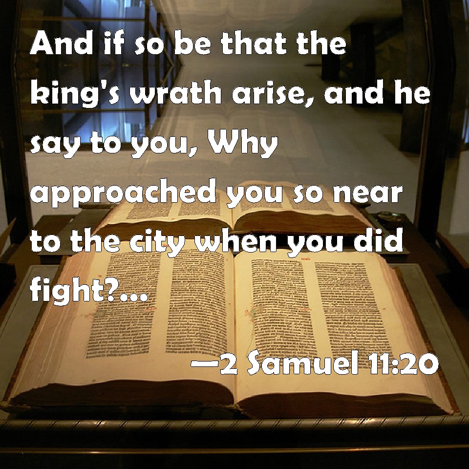 Choose a Background 2 Samuel 11:20 And if so be that the king's wrath arise, and he say to you, Why approached you so near to the city when you did fight? knew you not that they would shoot from the wall? KJV: And if so be that the king's wrath arise, and he say unto thee, Wherefore approached ye so nigh unto the city when ye did fight? knew ye not that they would shoot from the wall? DRB: If thou see him to be angry, and he shall say: Why did you approach so near to the wall to fight? knew you not that many darts are thrown from above off the wall? DBT: and if so be that the king's wrath arise, and he say to thee, Why did ye go so near to the city to fight? did ye not know that they would shoot from the wall? ERV: it shall be that, if the king's wrath arise, and he say unto thee, Wherefore went ye so nigh unto the city to fight? knew ye not that they would shoot from the wall? WBT: And if the king's wrath shall rise, and he shall say to thee, Why approached ye so nigh to the city for the fight? knew ye not that they would shoot from the wall? WEB: it shall be that, if the king's wrath arise, and he asks you, 'Why did you go so near to the city to fight? Didn't you know that they would shoot from the wall? YLT: then, it hath been, if the king's fury ascend, and he hath said to thee, Wherefore did ye draw nigh unto the city to fight? did ye not know that they shoot from off the wall?Links 2 Samuel 11:20 NIV • 2 Samuel 11:20 NLT • 2 Samuel 11:20 ESV • 2 Samuel 11:20 NASB • 2 Samuel 11:20 KJV • 2 Samuel 11:20 Interlinear • 2 Samuel 11:20 Commentaries • 2 Samuel 11:20 Parallel Texts • 2 Samuel 11:20 Bible Apps • 2 Samuel 11:20 Parallel • Bible Hub |