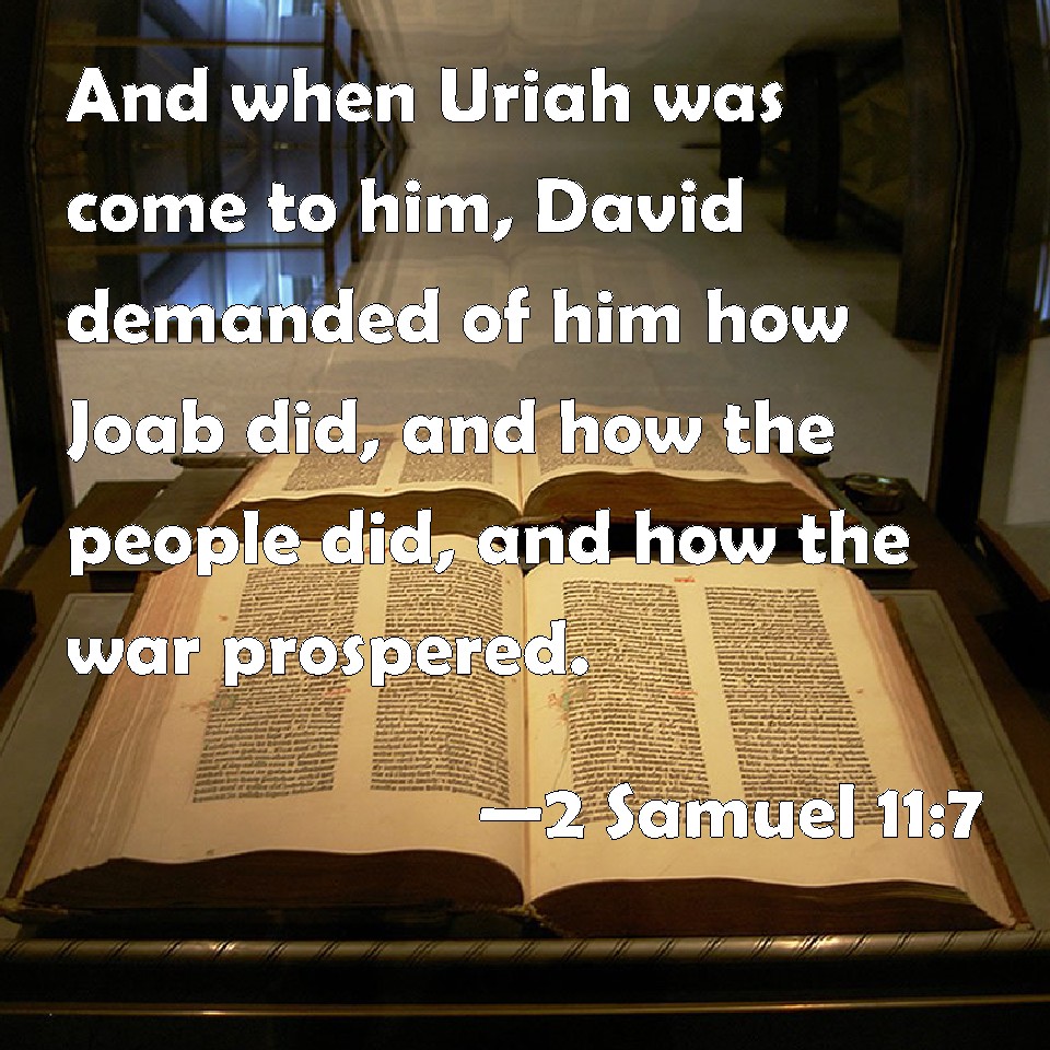 Choose a Background 2 Samuel 11:7 And when Uriah was come to him, David demanded of him how Joab did, and how the people did, and how the war prospered. KJV: And when Uriah was come unto him, David demanded of him how Joab did, and how the people did, and how the war prospered. DRB: And Urias came to David. And David asked how Joab did, and the people, and how the war was carried on. DBT: And when Urijah had come to him, David asked how Joab prospered, and how the people prospered, and how the war prospered. ERV: And when Uriah was come unto him, David asked of him how Joab did, and how the people fared, and how the war prospered. WBT: And when Uriah had come to him, David inquired of him how Joab did, and how the people did, and how the war prospered. WEB: When Uriah was come to him, David asked of him how Joab did, and how the people fared, and how the war prospered. YLT: and Uriah cometh unto him, and David asketh of the prosperity of Joab, and of the prosperity of the people, and of the prosperity of the war.Links 2 Samuel 11:7 NIV • 2 Samuel 11:7 NLT • 2 Samuel 11:7 ESV • 2 Samuel 11:7 NASB • 2 Samuel 11:7 KJV • 2 Samuel 11:7 Interlinear • 2 Samuel 11:7 Commentaries • 2 Samuel 11:7 Parallel Texts • 2 Samuel 11:7 Bible Apps • 2 Samuel 11:7 Parallel • Bible Hub |
