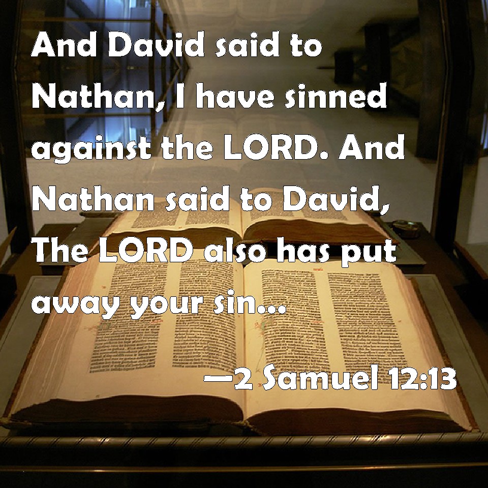 Choose a Background 2 Samuel 12:13 And David said to Nathan, I have sinned against the LORD. And Nathan said to David, The LORD also has put away your sin; you shall not die. KJV: And David said unto Nathan, I have sinned against the LORD. And Nathan said unto David, The LORD also hath put away thy sin; thou shalt not die. DRB: And David said to Nathan: I have sinned against the Lord. And Nathan said to David: The Lord also hath taken away thy sin: thou shalt not die. DBT: And David said to Nathan, I have sinned against Jehovah. And Nathan said to David, Jehovah has also put away thy sin: thou shalt not die. ERV: And David said unto Nathan, I have sinned against the LORD. And Nathan said unto David, The LORD also hath put away thy sin; thou shalt not die. WBT: And David said to Nathan, I have sinned against the LORD. And Nathan said to David, The LORD also hath put away thy sin; thou shalt not die. WEB: David said to Nathan, "I have sinned against Yahweh." Nathan said to David, "Yahweh also has put away your sin. You will not die. YLT: And David saith unto Nathan, 'I have sinned against Jehovah.' And Nathan saith unto David, 'Also — Jehovah hath caused thy sin to pass away; thou dost not die;Links 2 Samuel 12:13 NIV • 2 Samuel 12:13 NLT • 2 Samuel 12:13 ESV • 2 Samuel 12:13 NASB • 2 Samuel 12:13 KJV • 2 Samuel 12:13 Interlinear • 2 Samuel 12:13 Commentaries • 2 Samuel 12:13 Parallel Texts • 2 Samuel 12:13 Bible Apps • 2 Samuel 12:13 Parallel • Bible Hub |