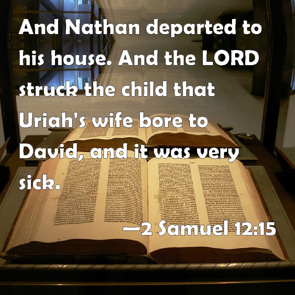 Choose a Background 2 Samuel 12:15 And Nathan departed to his house. And the LORD struck the child that Uriah's wife bore to David, and it was very sick. KJV: And Nathan departed unto his house. And the LORD struck the child that Uriah's wife bare unto David, and it was very sick. DRB: And Nathan returned to his house. The Lord also struck the child which the wife of Urias had borne to David, and his life was despaired of. DBT: And Nathan departed to his house. And Jehovah smote the child that Urijah's wife bore to David, and it became very sick. ERV: And Nathan departed unto his house. And the LORD struck the child that Uriah's wife bare unto David, and it was very sick. WBT: And Nathan departed to his house. And the LORD struck the child that Uriah's wife bore to David, and it was very sick. WEB: Nathan departed to his house. Yahweh struck the child that Uriah's wife bore to David, and it was very sick. YLT: And Nathan goeth unto his house, and Jehovah smiteth the lad, whom the wife of Uriah hath born to David, and it is incurable;Links 2 Samuel 12:15 NIV • 2 Samuel 12:15 NLT • 2 Samuel 12:15 ESV • 2 Samuel 12:15 NASB • 2 Samuel 12:15 KJV • 2 Samuel 12:15 Interlinear • 2 Samuel 12:15 Commentaries • 2 Samuel 12:15 Parallel Texts • 2 Samuel 12:15 Bible Apps • 2 Samuel 12:15 Parallel • Bible Hub |