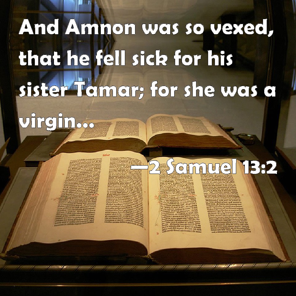 Amnon was so troubled that he fell sick because of his sister Tamar; for she was a virgin; and it seemed hard to Amnon to do anything to her.