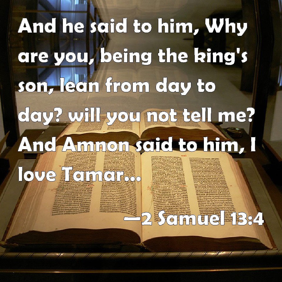 Choose a Background 2 Samuel 13:4 And he said to him, Why are you, being the king's son, lean from day to day? will you not tell me? And Amnon said to him, I love Tamar, my brother Absalom's sister. KJV: And he said unto him, Why art thou, being the king's son, lean from day to day? wilt thou not tell me? And Amnon said unto him, I love Tamar, my brother Absalom's sister. DRB: And he said to him: Why dost thou grow so lean from day to day, O son of the king? why dost thou not tell me the reason of it? And Amnon said to him: I am in love with Thamar the sister of my brother Absalom. DBT: And he said to him, Why dost thou, the king's son, get thinner from morning to morning? Wilt thou not tell me? And Amnon said to him, I love Tamar, my brother Absalom's sister. ERV: And he said unto him, Why, O son of the king, art thou thus lean from day to day? wilt thou not tell me? And Amnon said unto him, I love Tamar, my brother Absalom's sister. WBT: And he said to him, Why art thou, being the king's son, pining from day to day? wilt thou not tell me? And Amnon said to him, I love Tamar, my brother Absalom's sister. WEB: He said to him, "Why, son of the king, are you so sad from day to day? Won't you tell me?" Amnon said to him, "I love Tamar, my brother Absalom's sister." YLT: and saith to him, 'Wherefore art thou thus lean, O king's son, morning by morning? dost thou not declare to me?' And Amnon saith to him, 'Tamar — sister of Absalom my brother — I am loving.'Links 2 Samuel 13:4 NIV • 2 Samuel 13:4 NLT • 2 Samuel 13:4 ESV • 2 Samuel 13:4 NASB • 2 Samuel 13:4 KJV • 2 Samuel 13:4 Interlinear • 2 Samuel 13:4 Commentaries • 2 Samuel 13:4 Parallel Texts • 2 Samuel 13:4 Bible Apps • 2 Samuel 13:4 Parallel • Bible Hub |