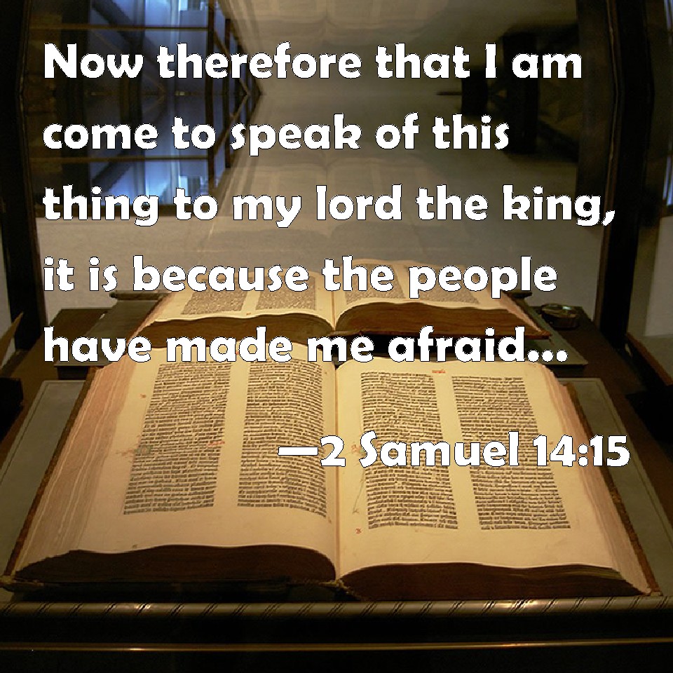 Choose a Background 2 Samuel 14:15 Now therefore that I am come to speak of this thing to my lord the king, it is because the people have made me afraid: and your handmaid said, I will now speak to the king; it may be that the king will perform the request of his handmaid. KJV: Now therefore that I am come to speak of this thing unto my lord the king, it is because the people have made me afraid: and thy handmaid said, I will now speak unto the king; it may be that the king will perform the request of his handmaid. DRB: Now therefore I am come, to speak this word to my lord the king before the people. And thy handmaid said: I will speak to the king, it maybe the king will perform the request of his handmaid. DBT: And now that I am come to speak of this thing to my lord the king, it is because the people have made me afraid; and thy bondmaid said, I will now speak to the king; perhaps the king will perform the request of his handmaid. ERV: Now therefore seeing that I am come to speak this word unto my lord the king, it is because the people have made me afraid: and thy handmaid said, I will now speak unto the king; it may be that the king will perform the request of his servant. WBT: Now therefore that I have come to speak of this thing to my lord the king, it is because the people have made me afraid: and thy handmaid said, I will now speak to the king; it may be that the king will perform the request of his handmaid. WEB: Now therefore seeing that I have come to speak this word to my lord the king, it is because the people have made me afraid: and your handmaid said, 'I will now speak to the king; it may be that the king will perform the request of his servant.' YLT: And now that I have come to speak unto the king my lord this word, it is because the people made me afraid, and thy maid-servant saith, Let me speak, I pray thee, unto the king; it may be the king doth do the word of his handmaid,Links 2 Samuel 14:15 NIV • 2 Samuel 14:15 NLT • 2 Samuel 14:15 ESV • 2 Samuel 14:15 NASB • 2 Samuel 14:15 KJV • 2 Samuel 14:15 Interlinear • 2 Samuel 14:15 Commentaries • 2 Samuel 14:15 Parallel Texts • 2 Samuel 14:15 Bible Apps • 2 Samuel 14:15 Parallel • Bible Hub |