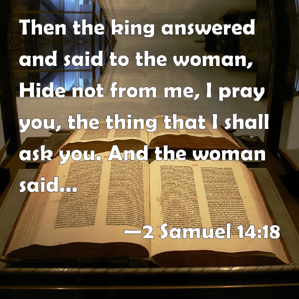 Choose a Background 2 Samuel 14:18 Then the king answered and said to the woman, Hide not from me, I pray you, the thing that I shall ask you. And the woman said, Let my lord the king now speak. KJV: Then the king answered and said unto the woman, Hide not from me, I pray thee, the thing that I shall ask thee. And the woman said, Let my lord the king now speak. DRB: And the king answering, said to the woman: Hide not from me the thing that I ask thee. And the woman said to him: Speak, my lord the king. DBT: And the king answered and said to the woman, Hide not from me, I pray thee, the thing that I shall ask thee. And the woman said, Let my lord the king now speak. ERV: Then the king answered and said unto the woman, Hide not from me, I pray thee, aught that I shall ask thee. And the woman said, Let my lord the king now speak. WBT: Then the king answered and said to the woman, Hide not from me, I pray thee, the thing that I shall ask thee. And the woman said, Let my lord the king now speak. WEB: Then the king answered the woman, "Please don't hide anything from me that I ask you." The woman said, "Let my lord the king now speak." YLT: And the king answereth and saith unto the woman, 'Do not, I pray thee, hide from me the thing that I am asking thee;' and the woman saith, 'Let, I pray thee, my lord the king speak.'Links 2 Samuel 14:18 NIV • 2 Samuel 14:18 NLT • 2 Samuel 14:18 ESV • 2 Samuel 14:18 NASB • 2 Samuel 14:18 KJV • 2 Samuel 14:18 Interlinear • 2 Samuel 14:18 Commentaries • 2 Samuel 14:18 Parallel Texts • 2 Samuel 14:18 Bible Apps • 2 Samuel 14:18 Parallel • Bible Hub |