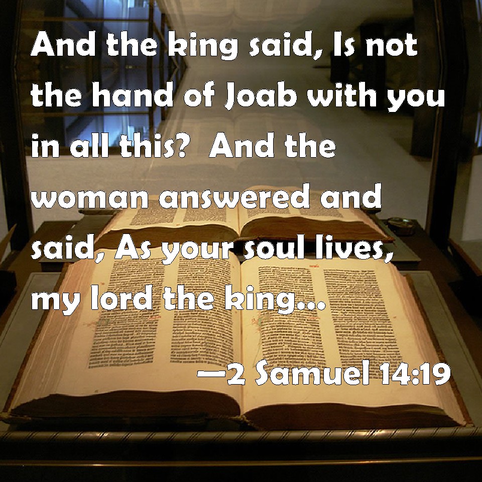 Choose a Background 2 Samuel 14:19 And the king said, Is not the hand of Joab with you in all this? And the woman answered and said, As your soul lives, my lord the king, none can turn to the right hand or to the left from ought that my lord the king has spoken: for your servant Joab, he bade me, and he put all these words in the mouth of your handmaid: KJV: And the king said, Is not the hand of Joab with thee in all this? And the woman answered and said, As thy soul liveth, my lord the king, none can turn to the right hand or to the left from ought that my lord the king hath spoken: for thy servant Joab, he bade me, and he put all these words in the mouth of thine handmaid: DRB: And the king said: Is not the hand of Joab with thee in all this? The woman answered, and said: By the health of thy soul, my lord, O king, it is neither on the left hand, nor on the right, in all these things which my lord the king hath spoken: for thy servant Joab, he commanded me, and he put all these words into the mouth of thy handmaid. DBT: And the king said, Is the hand of Joab with thee in all this? And the woman answered and said, As thy soul liveth, my lord, O king, there is no turning to the right hand or to the left from aught that my lord the king has spoken; for thy servant Joab, he bade me, and he put all these words into the mouth of thy bondmaid: ERV: And the king said, Is the hand of Joab with thee in all this? And the woman answered and said, As thy soul liveth, my lord the king, none can turn to the right hand or to the left from aught that my lord the king hath spoken: for thy servant Joab, he bade me, and he put all these words in the mouth of thine handmaid; WBT: And the king said, Is not the hand of Joab with thee in all this? And the woman answered and said, As thy soul liveth, my lord the king, none can turn to the right hand or to the left from aught that my lord the king hath spoken: for thy servant Joab, he bade me, and he put all these words in the mouth of thy handmaid: WEB: The king said, "Is the hand of Joab with you in all this?" The woman answered, "As your soul lives, my lord the king, no one can turn to the right hand or to the left from anything that my lord the king has spoken; for your servant Joab, he urged me, and he put all these words in the mouth of your handmaid; YLT: And the king saith, 'Is the hand of Joab with thee in all this?' And the woman answereth and saith, 'Thy soul liveth, my lord, O king, none doth turn to the right or to the left from all that my lord the king hath spoken; for thy servant Joab he commanded me, and he put in the mouth of thy maid-servant all these words;Links 2 Samuel 14:19 NIV • 2 Samuel 14:19 NLT • 2 Samuel 14:19 ESV • 2 Samuel 14:19 NASB • 2 Samuel 14:19 KJV • 2 Samuel 14:19 Interlinear • 2 Samuel 14:19 Commentaries • 2 Samuel 14:19 Parallel Texts • 2 Samuel 14:19 Bible Apps • 2 Samuel 14:19 Parallel • Bible Hub |