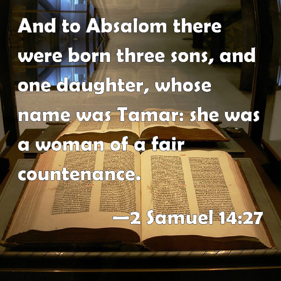 Choose a Background 2 Samuel 14:27 And to Absalom there were born three sons, and one daughter, whose name was Tamar: she was a woman of a fair countenance. KJV: And unto Absalom there were born three sons, and one daughter, whose name was Tamar: she was a woman of a fair countenance. DRB: And there were born to Absalom three sons: and one daughter, whose, name was Thamar, and she was very beautiful. DBT: And to Absalom there were born three sons, and one daughter, whose name was Tamar: she was a woman of a beautiful countenance. ERV: And unto Absalom there were born three sons, and one daughter, whose name was Tamar: she was a woman of a fair countenance. WBT: And to Absalom there were born three sons, and one daughter, whose name was Tamar: she was a woman of a fair countenance. WEB: To Absalom there were born three sons, and one daughter, whose name was Tamar: she was a woman of a beautiful face. YLT: And there are born to Absalom three sons, and one daughter, and her name is Tamar; she was a woman of a fair appearance.Links 2 Samuel 14:27 NIV • 2 Samuel 14:27 NLT • 2 Samuel 14:27 ESV • 2 Samuel 14:27 NASB • 2 Samuel 14:27 KJV • 2 Samuel 14:27 Interlinear • 2 Samuel 14:27 Commentaries • 2 Samuel 14:27 Parallel Texts • 2 Samuel 14:27 Bible Apps • 2 Samuel 14:27 Parallel • Bible Hub |