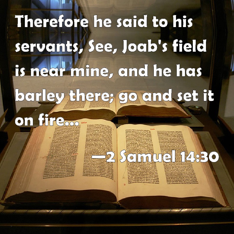 Choose a Background 2 Samuel 14:30 Therefore he said to his servants, See, Joab's field is near mine, and he has barley there; go and set it on fire. And Absalom's servants set the field on fire. KJV: Therefore he said unto his servants, See, Joab's field is near mine, and he hath barley there; go and set it on fire. And Absalom's servants set the field on fire. DRB: He said to his servants: You know the field of Joab near my field, that hath a crop of barley: go now and set it on fire. So the servants of Absalom set the corn on fire. And Joab's servants coming with their garments rent, said: The servants of Absalom have set part of the field on fire. DBT: Then he said to his servants, See, Joab's allotment is near mine and he has barley there: go and set it on fire. And Absalom's servants set the allotment on fire. ERV: Therefore he said unto his servants, See, Joab's field is near mine, and he hath barley there; go and set it on fire. And Absalom's servants set the field on fire. WBT: Therefore he said to his servants, See, Joab's field is near mine, and he hath barley there; go and set it on fire. And Absalom's servants set the field on fire. WEB: Therefore he said to his servants, "Behold, Joab's field is near mine, and he has barley there. Go and set it on fire." Absalom's servants set the field on fire. YLT: And he saith unto his servants, 'See, the portion of Joab is by the side of mine, and he hath barley there; go, and burn it with fire;' and the servants of Absalom burn the portion with fire.Links 2 Samuel 14:30 NIV • 2 Samuel 14:30 NLT • 2 Samuel 14:30 ESV • 2 Samuel 14:30 NASB • 2 Samuel 14:30 KJV • 2 Samuel 14:30 Interlinear • 2 Samuel 14:30 Commentaries • 2 Samuel 14:30 Parallel Texts • 2 Samuel 14:30 Bible Apps • 2 Samuel 14:30 Parallel • Bible Hub |