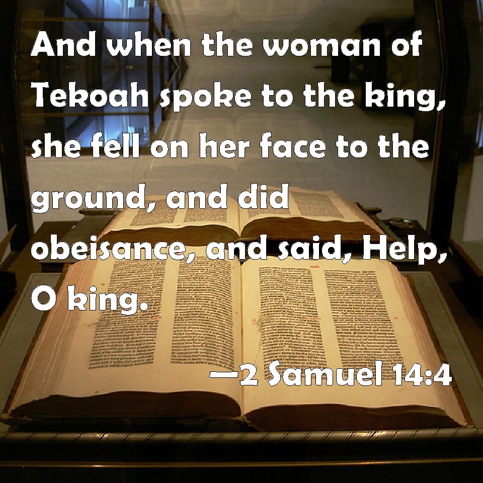 Choose a Background 2 Samuel 14:4 And when the woman of Tekoah spoke to the king, she fell on her face to the ground, and did obeisance, and said, Help, O king. KJV: And when the woman of Tekoah spake to the king, she fell on her face to the ground, and did obeisance, and said, Help, O king. DRB: And when the woman of Thecua was come in to the king, she fell before him upon the ground, and worshipped, and said: Save me, O king. DBT: And the woman of Tekoah spoke to the king, and she fell on her face to the ground and did obeisance, and said, Save, O king! ERV: And when the woman of Tekoa spake to the king, she fell on her face to the ground, and did obeisance, and said, Help, O king. WBT: And when the woman of Tekoah spoke to the king, she fell on her face to the ground, and did obeisance, and said, Help, O king. WEB: When the woman of Tekoa spoke to the king, she fell on her face to the ground, and did obeisance, and said, "Help, O king!" YLT: And the woman of Tekoah speaketh unto the king, and falleth on her face to the earth, and doth obeisance, and saith, 'Save, O king.'Links 2 Samuel 14:4 NIV • 2 Samuel 14:4 NLT • 2 Samuel 14:4 ESV • 2 Samuel 14:4 NASB • 2 Samuel 14:4 KJV • 2 Samuel 14:4 Interlinear • 2 Samuel 14:4 Commentaries • 2 Samuel 14:4 Parallel Texts • 2 Samuel 14:4 Bible Apps • 2 Samuel 14:4 Parallel • Bible Hub |