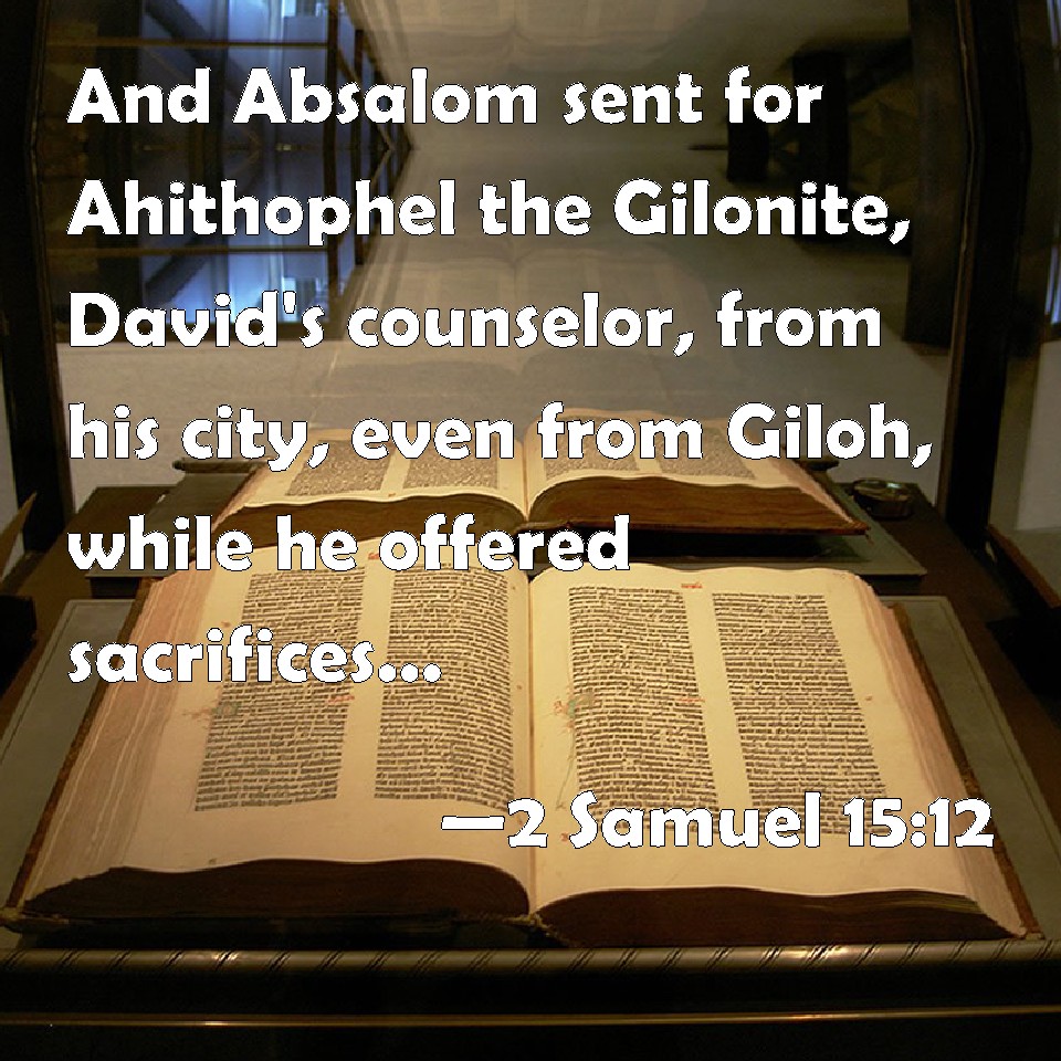 Choose a Background 2 Samuel 15:12 And Absalom sent for Ahithophel the Gilonite, David's counselor, from his city, even from Giloh, while he offered sacrifices. And the conspiracy was strong; for the people increased continually with Absalom. KJV: And Absalom sent for Ahithophel the Gilonite, David's counseller, from his city, even from Giloh, while he offered sacrifices. And the conspiracy was strong; for the people increased continually with Absalom. DRB: Absalom also sent for Achitophel the Gilonite, David's counsellor, from his city Gilo. And while he was offering sacrifices, there was a strong conspiracy, and the people running together increased with Absalom. DBT: And Absalom sent for Ahithophel the Gilonite, David's counsellor, from his city, from Giloh, while he offered the sacrifices. And the conspiracy gathered strength; and the people increased continually with Absalom. ERV: And Absalom sent for Ahithophel the Gilonite, David's counsellor, from his city, even from Giloh, while he offered the sacrifices. And the conspiracy was strong; for the people increased continually with Absalom. WBT: And Absalom sent for Ahithophel the Gilonite, David's counselor, from his city, even from Giloh, while he offered sacrifices. And the conspiracy was strong; for the people increased continually with Absalom. WEB: Absalom sent for Ahithophel the Gilonite, David's counselor, from his city, even from Giloh, while he was offering the sacrifices. The conspiracy was strong; for the people increased continually with Absalom. YLT: and Absalom sendeth Ahithophel the Gilonite, a counsellor of David, out of his city, out of Gilo, in his sacrificing sacrifices; and the conspiracy is strong, and the people are going and increasing with Absalom.Links 2 Samuel 15:12 NIV • 2 Samuel 15:12 NLT • 2 Samuel 15:12 ESV • 2 Samuel 15:12 NASB • 2 Samuel 15:12 KJV • 2 Samuel 15:12 Interlinear • 2 Samuel 15:12 Commentaries • 2 Samuel 15:12 Parallel Texts • 2 Samuel 15:12 Bible Apps • 2 Samuel 15:12 Parallel • Bible Hub |