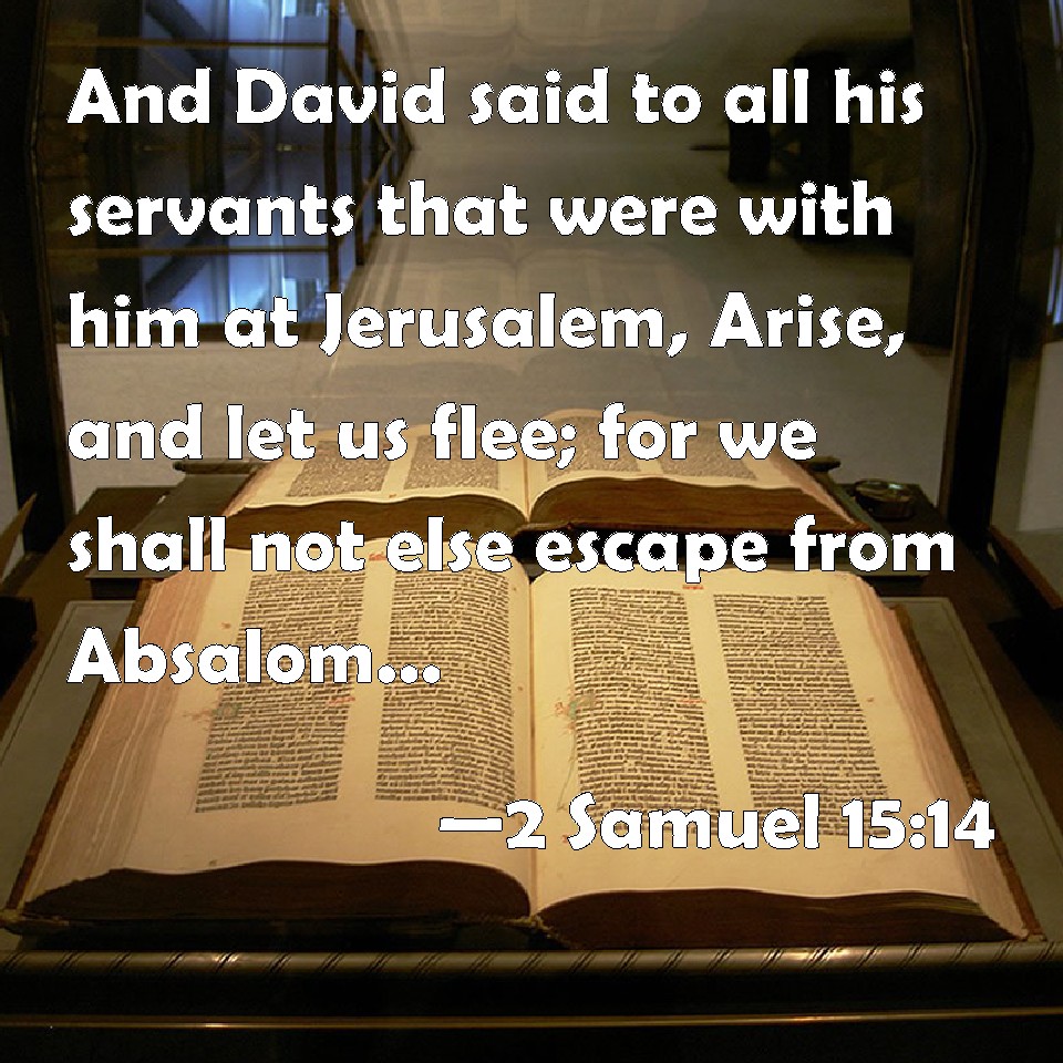 Choose a Background 2 Samuel 15:14 And David said to all his servants that were with him at Jerusalem, Arise, and let us flee; for we shall not else escape from Absalom: make speed to depart, lest he overtake us suddenly, and bring evil on us, and smite the city with the edge of the sword. KJV: And David said unto all his servants that were with him at Jerusalem, Arise, and let us flee; for we shall not else escape from Absalom: make speed to depart, lest he overtake us suddenly, and bring evil upon us, and smite the city with the edge of the sword. DRB: And David said to his servants, that were with him in Jerusalem: Arise and let us flee: for we shall not escape else from the face of Absalom: make haste to go out, lest he come and overtake us, and bring ruin upon us, and smite the city with the edge of the sword. DBT: And David said to all his servants that were with him at Jerusalem, Rise up and let us flee; for we shall not else escape from Absalom. Be quick to depart, lest he overtake us quickly, and bring evil upon us, and smite the city with the edge of the sword. ERV: And David said unto all his servants that were with him at Jerusalem, Arise, and let us flee; for else none of us shall escape from Absalom: make speed to depart, lest he overtake us quickly, and bring down evil upon us, and smite the city with the edge of the sword. WBT: And David said to all his servants that were with him at Jerusalem, Arise, and let us flee; for we shall not else escape from Absalom: make speed to depart, lest he should overtake us suddenly, and bring evil upon us, and smite the city with the edge of the sword. WEB: David said to all his servants who were with him at Jerusalem, "Arise, and let us flee; for else none of us shall escape from Absalom. Make speed to depart, lest he overtake us quickly, and bring down evil on us, and strike the city with the edge of the sword." YLT: And David saith to all his servants who are with him in Jerusalem, 'Rise, and we flee, for we have no escape from the face of Absalom; haste to go, lest he hasten, and have overtaken us, and forced on us evil, and smitten the city by the mouth of the sword.'Links 2 Samuel 15:14 NIV • 2 Samuel 15:14 NLT • 2 Samuel 15:14 ESV • 2 Samuel 15:14 NASB • 2 Samuel 15:14 KJV • 2 Samuel 15:14 Interlinear • 2 Samuel 15:14 Commentaries • 2 Samuel 15:14 Parallel Texts • 2 Samuel 15:14 Bible Apps • 2 Samuel 15:14 Parallel • Bible Hub |