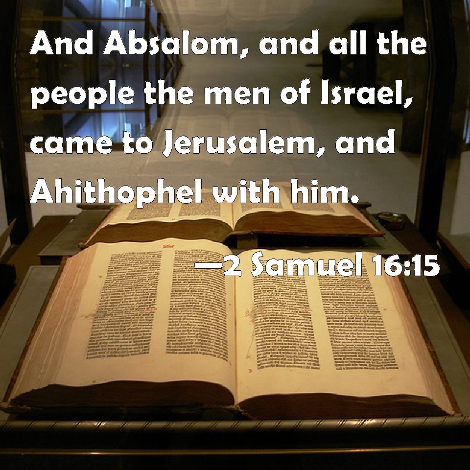 Choose a Background 2 Samuel 16:15 And Absalom, and all the people the men of Israel, came to Jerusalem, and Ahithophel with him. KJV: And Absalom, and all the people the men of Israel, came to Jerusalem, and Ahithophel with him. DRB: But Absalom and all his people came into Jerusalem, and Achitophel was with him. DBT: Now Absalom, and all the people, the men of Israel, came to Jerusalem, and Ahithophel with him. ERV: And Absalom, and all the people the men of Israel, came to Jerusalem, and Ahithophel with him. WBT: And Absalom, and all the people the men of Israel, came to Jerusalem, and Ahithophel with him. WEB: Absalom, and all the people, the men of Israel, came to Jerusalem, and Ahithophel with him. YLT: And Absalom and all the people, the men of Israel, have come in to Jerusalem, and Ahithophel with him,Links 2 Samuel 16:15 NIV • 2 Samuel 16:15 NLT • 2 Samuel 16:15 ESV • 2 Samuel 16:15 NASB • 2 Samuel 16:15 KJV • 2 Samuel 16:15 Interlinear • 2 Samuel 16:15 Commentaries • 2 Samuel 16:15 Parallel Texts • 2 Samuel 16:15 Bible Apps • 2 Samuel 16:15 Parallel • Bible Hub |