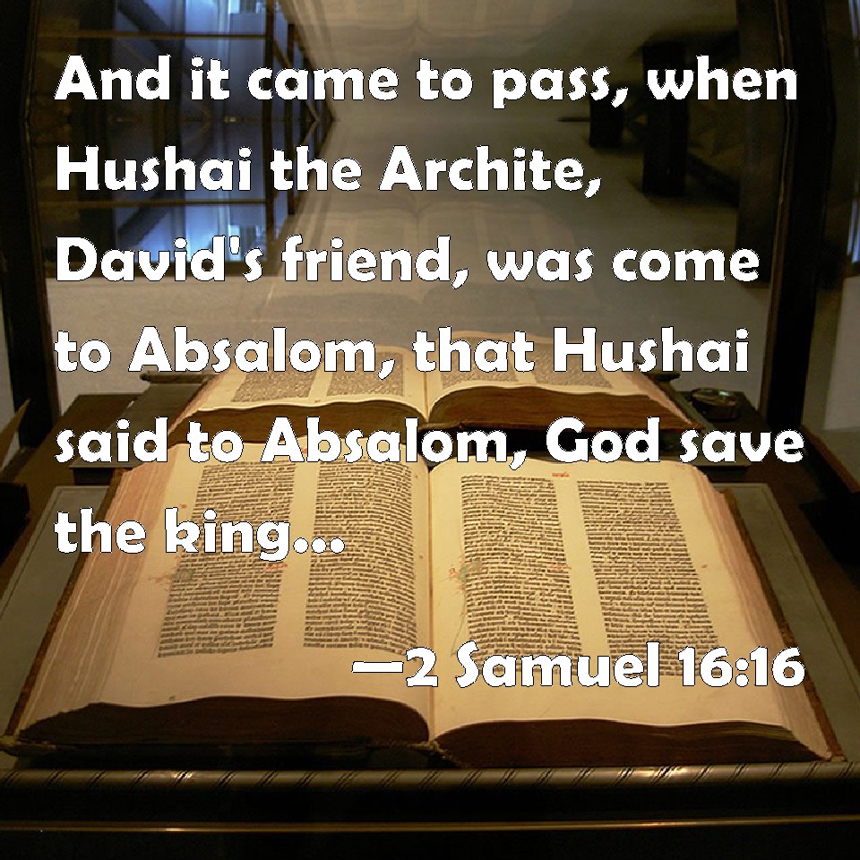 Choose a Background 2 Samuel 16:16 And it came to pass, when Hushai the Archite, David's friend, was come to Absalom, that Hushai said to Absalom, God save the king, God save the king. KJV: And it came to pass, when Hushai the Archite, David's friend, was come unto Absalom, that Hushai said unto Absalom, God save the king, God save the king. DRB: And when Chusai the Arachite, David's friend, was come to Absalom, he said to him: God save thee, O king, God save thee, O king. DBT: And it came to pass, when Hushai the Archite, David's friend, came to Absalom, that Hushai said to Absalom, Long live the king! Long live the king! ERV: And it came to pass, when Hushai the Archite, David's friend, was come unto Absalom, that Hushai said unto Absalom, God save the king, God save the king. WBT: And it came to pass, when Hushai the Archite, David's friend, had come to Absalom, that Hushai said to Absalom, God save the king, God save the king. WEB: It happened, when Hushai the Archite, David's friend, had come to Absalom, that Hushai said to Absalom, "Long live the king! Long live the king!" YLT: and it cometh to pass, when Hushai the Archite, David's friend, hath come unto Absalom, that Hushai saith unto Absalom, 'Let the king live! let the king live!'Links 2 Samuel 16:16 NIV • 2 Samuel 16:16 NLT • 2 Samuel 16:16 ESV • 2 Samuel 16:16 NASB • 2 Samuel 16:16 KJV • 2 Samuel 16:16 Interlinear • 2 Samuel 16:16 Commentaries • 2 Samuel 16:16 Parallel Texts • 2 Samuel 16:16 Bible Apps • 2 Samuel 16:16 Parallel • Bible Hub |