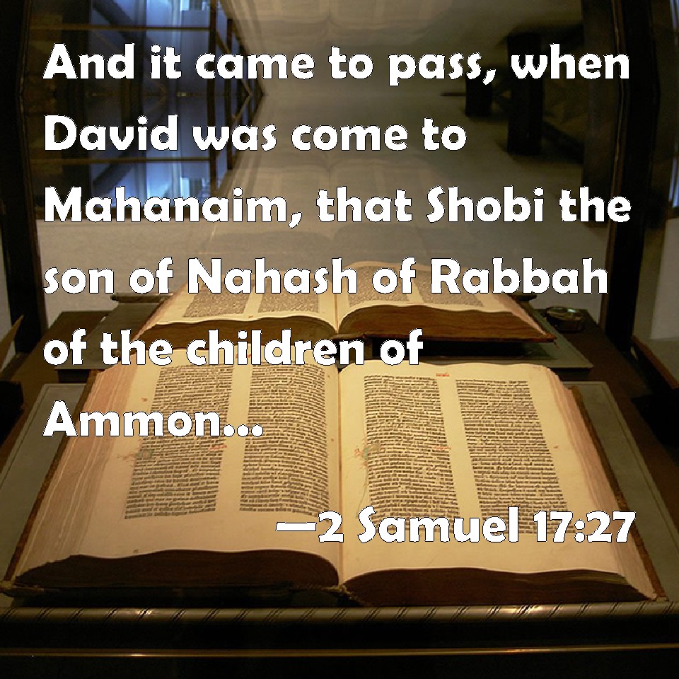 Choose a Background 2 Samuel 17:27 And it came to pass, when David was come to Mahanaim, that Shobi the son of Nahash of Rabbah of the children of Ammon, and Machir the son of Ammiel of Lodebar, and Barzillai the Gileadite of Rogelim, KJV: And it came to pass, when David was come to Mahanaim, that Shobi the son of Nahash of Rabbah of the children of Ammon, and Machir the son of Ammiel of Lodebar, and Barzillai the Gileadite of Rogelim, DRB: And when David was come to the camp, Sobi the son of Naas of Rabbath of the children of Ammon, and Machir the son of Ammihel of Lodabar, and Berzellai the Galaadite of Rogelim, DBT: And as soon as David came to Mahanaim, Shobi the son of Nahash of Rabbah of the children of Ammon, and Machir the son of Ammiel of Lo-debar, and Barzillai the Gileadite of Rogelim, ERV: And it came to pass, when David was come to Mahanaim, that Shobi the son of Nahash of Rabbah of the children of Ammon, and Machir the son of Ammiel of Lo-debar, and Barzillai the Gileadite of Rogelim, WBT: And it came to pass, when David had come to Mahanaim, that Shobi the son of Nahash of Rabbah of the children of Ammon, and Machir the son of Ammiel of Lo-debar, and Barzillai the Gileadite of Rogelim, WEB: It happened, when David was come to Mahanaim, that Shobi the son of Nahash of Rabbah of the children of Ammon, and Machir the son of Ammiel of Lodebar, and Barzillai the Gileadite of Rogelim, YLT: And it cometh to pass at the coming in of David to Mahanaim, that Shobi, son of Nahash, from Rabbah of the Bene-Ammon, and Machir son of Ammiel, from Lo-Debar, and Barzillai the Gileadite, from Rogelim,Links 2 Samuel 17:27 NIV • 2 Samuel 17:27 NLT • 2 Samuel 17:27 ESV • 2 Samuel 17:27 NASB • 2 Samuel 17:27 KJV • 2 Samuel 17:27 Interlinear • 2 Samuel 17:27 Commentaries • 2 Samuel 17:27 Parallel Texts • 2 Samuel 17:27 Bible Apps • 2 Samuel 17:27 Parallel • Bible Hub |