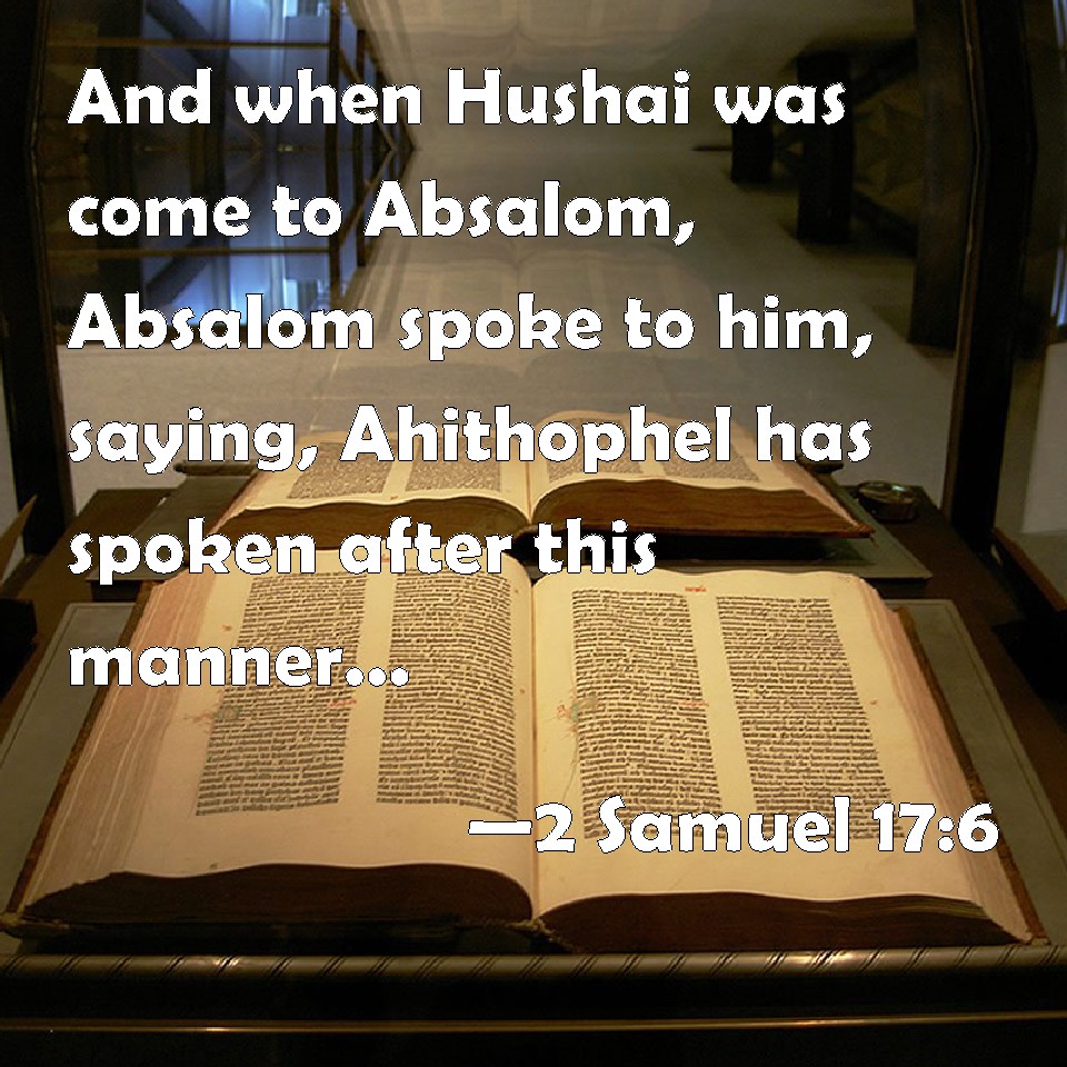 Choose a Background 2 Samuel 17:6 And when Hushai was come to Absalom, Absalom spoke to him, saying, Ahithophel has spoken after this manner: shall we do after his saying? if not; speak you. KJV: And when Hushai was come to Absalom, Absalom spake unto him, saying, Ahithophel hath spoken after this manner: shall we do after his saying? if not; speak thou. DRB: And when Chusai was come to Absalom, Absalom said to him: Achitophel hath spoken after this manner: shall we do it or not? what counsel dost thou give? DBT: And Hushai came to Absalom, and Absalom spoke to him saying, Ahithophel has spoken after this manner: shall we carry out his word? If not, speak thou. ERV: And when Hushai was come to Absalom, Absalom spake unto him, saying, Ahithophel hath spoken after this manner: shall we do after his saying? if not, speak thou. WBT: And when Hushai had come to Absalom, Absalom spoke to him, saying, Ahithophel hath spoken after this manner: shall we do after his saying? if not, speak thou. WEB: When Hushai was come to Absalom, Absalom spoke to him, saying, "Ahithophel has spoken like this. Shall we do what he says? If not, speak up." YLT: And Hushai cometh in unto Absalom, and Absalom speaketh unto him, saying, 'According to this word hath Ahithophel spoken; do we do his word? if not, thou — speak thou.'Links 2 Samuel 17:6 NIV • 2 Samuel 17:6 NLT • 2 Samuel 17:6 ESV • 2 Samuel 17:6 NASB • 2 Samuel 17:6 KJV • 2 Samuel 17:6 Interlinear • 2 Samuel 17:6 Commentaries • 2 Samuel 17:6 Parallel Texts • 2 Samuel 17:6 Bible Apps • 2 Samuel 17:6 Parallel • Bible Hub |