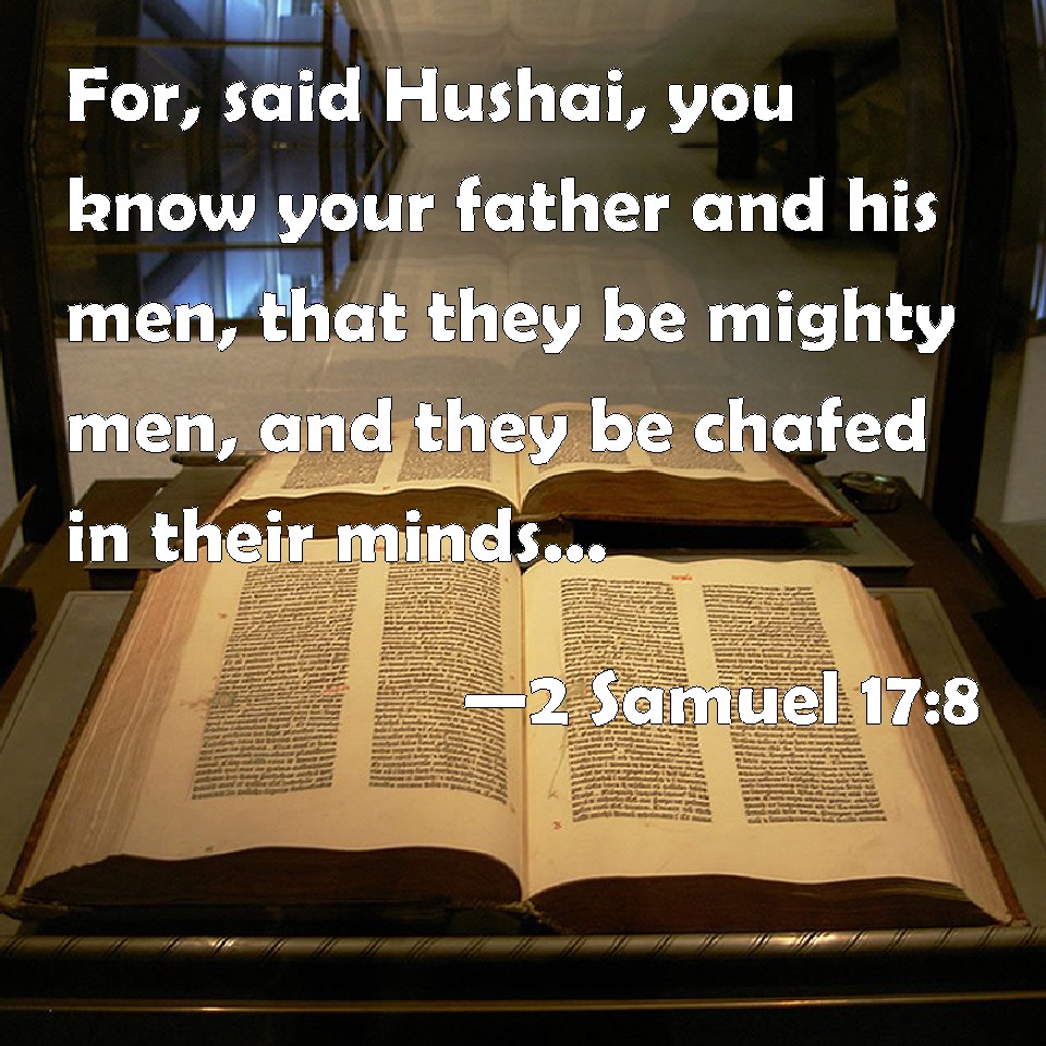 Choose a Background 2 Samuel 17:8 For, said Hushai, you know your father and his men, that they be mighty men, and they be chafed in their minds, as a bear robbed of her whelps in the field: and your father is a man of war, and will not lodge with the people. KJV: For, said Hushai, thou knowest thy father and his men, that they be mighty men, and they be chafed in their minds, as a bear robbed of her whelps in the field: and thy father is a man of war, and will not lodge with the people. DRB: And again Chusai said: Thou knowest thy father, and the men that are with him, that they are very valiant, and bitter in their mind, as a bear raging in the wood when her whelps are taken away: and thy father is a warrior, and will not lodge with the people. DBT: And Hushai said, Thou knowest thy father and his men, that they are mighty men, and they are of exasperated spirit, as a bear robbed of her whelps in the field; and thy father is a man of war, and will not lodge with the people. ERV: Hushai said moreover, Thou knowest thy father and his men, that they be mighty men, and they be chafed in their minds, as a bear robbed of her whelps in the field: and thy father is a man of war, and will not lodge with the people. WBT: For, said Hushai, thou knowest thy father and his men, that they are mighty men, and they are chafed in their minds, as a bear robbed of her whelps in the field: and thy father is a man of war, and will not lodge with the people. WEB: Hushai said moreover, "You know your father and his men, that they are mighty men, and they are fierce in their minds, like a bear robbed of her cubs in the field. Your father is a man of war, and will not lodge with the people. YLT: And Hushai saith, 'Thou hast known thy father and his men, that they are heroes, and they are bitter in soul as a bereaved bear in a field, and thy father is a man of war, and doth not lodge with the people;Links 2 Samuel 17:8 NIV • 2 Samuel 17:8 NLT • 2 Samuel 17:8 ESV • 2 Samuel 17:8 NASB • 2 Samuel 17:8 KJV • 2 Samuel 17:8 Interlinear • 2 Samuel 17:8 Commentaries • 2 Samuel 17:8 Parallel Texts • 2 Samuel 17:8 Bible Apps • 2 Samuel 17:8 Parallel • Bible Hub |