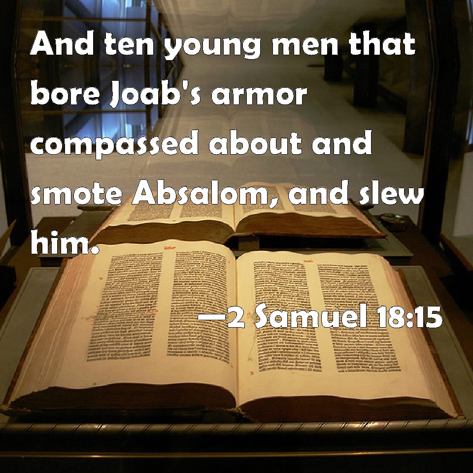 Choose a Background 2 Samuel 18:15 And ten young men that bore Joab's armor compassed about and smote Absalom, and slew him. KJV: And ten young men that bare Joab's armour compassed about and smote Absalom, and slew him. DRB: Ten young men, armourbearers of Joab, ran up, and striking him slew him. DBT: And ten young men that bore Joab's armour surrounded and smote Absalom, and killed him. ERV: And ten young men that bare Joab's armour compassed about and smote Absalom, and slew him. WBT: And ten young men that bore Joab's armor compassed about and smote Absalom, and slew him. WEB: Ten young men who bore Joab's armor surrounded and struck Absalom, and killed him. YLT: And they go round — ten youths bearing weapons of Joab — and smite Absalom, and put him to death.Links 2 Samuel 18:15 NIV • 2 Samuel 18:15 NLT • 2 Samuel 18:15 ESV • 2 Samuel 18:15 NASB • 2 Samuel 18:15 KJV • 2 Samuel 18:15 Interlinear • 2 Samuel 18:15 Commentaries • 2 Samuel 18:15 Parallel Texts • 2 Samuel 18:15 Bible Apps • 2 Samuel 18:15 Parallel • Bible Hub |