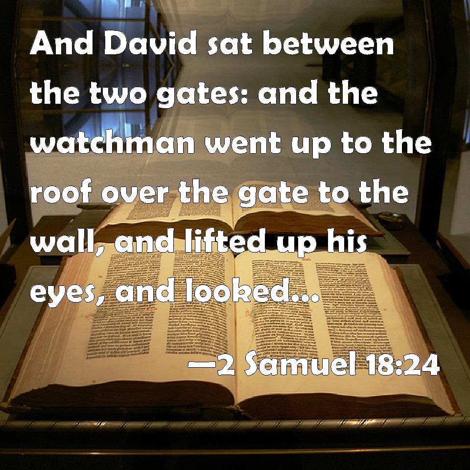 Choose a Background 2 Samuel 18:24 And David sat between the two gates: and the watchman went up to the roof over the gate to the wall, and lifted up his eyes, and looked, and behold a man running alone. KJV: And David sat between the two gates: and the watchman went up to the roof over the gate unto the wall, and lifted up his eyes, and looked, and behold a man running alone. DRB: And David sat between the two gates: and the watchman that was on the top of the gate upon the wall, lifting up his eyes, saw a man running alone. DBT: And David sat between the two gates; and the watchman went up to the roof of the gate, on to the wall, and lifted up his eyes and looked, and behold, a man running alone. ERV: Now David sat between the two gates: and the watchman went up to the roof of the gate unto the wall, and lifted up his eyes, and looked, and, behold, a man running alone. WBT: And David sat between the two gates: and the watchman went up to the roof over the gate to the wall, and lifted up his eyes, and looked, and behold a man running alone. WEB: Now David was sitting between the two gates: and the watchman went up to the roof of the gate to the wall, and lifted up his eyes, and looked, and, behold, a man running alone. YLT: And David is sitting between the two gates, and the watchman goeth unto the roof of the gate, unto the wall, and lifteth up his eyes, and looketh, and lo, a man running by himself.Links 2 Samuel 18:24 NIV • 2 Samuel 18:24 NLT • 2 Samuel 18:24 ESV • 2 Samuel 18:24 NASB • 2 Samuel 18:24 KJV • 2 Samuel 18:24 Interlinear • 2 Samuel 18:24 Commentaries • 2 Samuel 18:24 Parallel Texts • 2 Samuel 18:24 Bible Apps • 2 Samuel 18:24 Parallel • Bible Hub |
