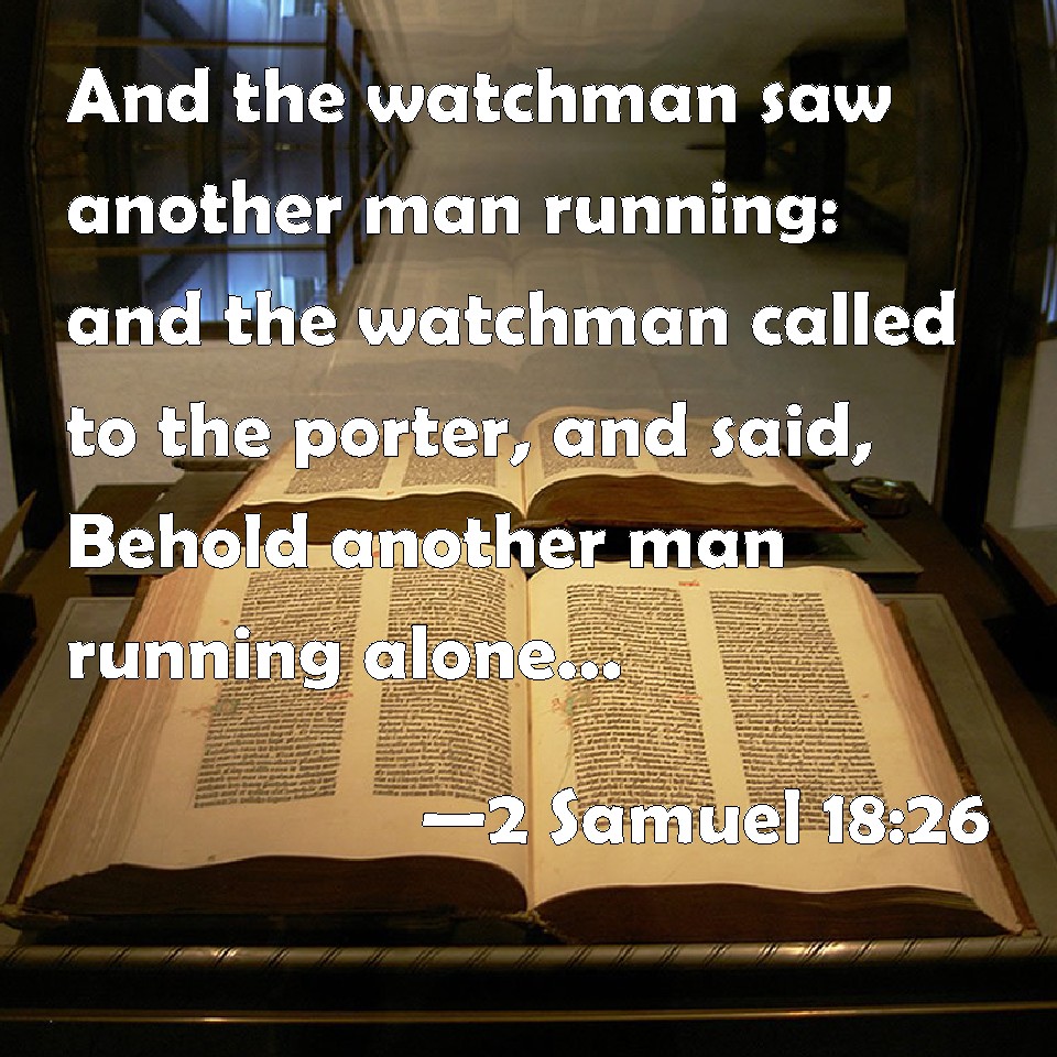 Choose a Background 2 Samuel 18:26 And the watchman saw another man running: and the watchman called to the porter, and said, Behold another man running alone. And the king said, He also brings tidings. KJV: And the watchman saw another man running: and the watchman called unto the porter, and said, Behold another man running alone. And the king said, He also bringeth tidings. DRB: The watchman saw another man running, and crying aloud from above, he said: I see another man running alone. And the king said: He also is a good messenger. DBT: And the watchman saw another man running; and the watchman called to the porter and said, Behold a man running alone. And the king said, He also is a bearer of news. ERV: And the watchman saw another man running: and the watchman called unto the porter, and said, Behold, another man running alone. And the king said, He also bringeth tidings. WBT: And the watchman saw another man running: and the watchman called to the porter, and said, Behold another man running alone. And the king said, He also bringeth tidings. WEB: The watchman saw another man running; and the watchman called to the porter, and said, "Behold, a man running alone!" The king said, "He also brings news." YLT: And the watchman seeth another man running, and the watchman calleth unto the gatekeeper, and saith, 'Lo, a man running by himself;' and the king saith, 'Also this one is bearing tidings.'Links 2 Samuel 18:26 NIV • 2 Samuel 18:26 NLT • 2 Samuel 18:26 ESV • 2 Samuel 18:26 NASB • 2 Samuel 18:26 KJV • 2 Samuel 18:26 Interlinear • 2 Samuel 18:26 Commentaries • 2 Samuel 18:26 Parallel Texts • 2 Samuel 18:26 Bible Apps • 2 Samuel 18:26 Parallel • Bible Hub |
