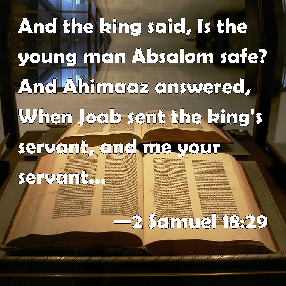 Choose a Background 2 Samuel 18:29 And the king said, Is the young man Absalom safe? And Ahimaaz answered, When Joab sent the king's servant, and me your servant, I saw a great tumult, but I knew not what it was. KJV: And the king said, Is the young man Absalom safe? And Ahimaaz answered, When Joab sent the king's servant, and me thy servant, I saw a great tumult, but I knew not what it was. DRB: And the king said: Is the young man Absalom safe? And Achimaas said: I saw a great tumult, O king, when thy servant Joab sent me thy servant: I know nothing else. DBT: And the king said, Is it well with the young man Absalom? And Ahimaaz said, I saw a great tumult when Joab sent the king's servant, and me thy servant; but I knew not what it was. ERV: And the king said, Is it well with the young man Absalom? And Ahimaaz answered, When Joab sent the king's servant, even me thy servant, I saw a great tumult, but I knew not what it was. WBT: And the king said, Is the young man Absalom safe? And Ahimaaz answered, When Joab sent the king's servant, and me thy servant, I saw a great tumult, but I knew not what it was. WEB: The king said, "Is it well with the young man Absalom?" Ahimaaz answered, "When Joab sent the king's servant, even me your servant, I saw a great tumult, but I don't know what it was." YLT: And the king saith, 'Peace to the youth — to Absalom?' And Ahimaaz saith, 'I saw the great multitude, at the sending away of the servant of the king, even thy servant by Joab, and I have not known what it is.'Links 2 Samuel 18:29 NIV • 2 Samuel 18:29 NLT • 2 Samuel 18:29 ESV • 2 Samuel 18:29 NASB • 2 Samuel 18:29 KJV • 2 Samuel 18:29 Interlinear • 2 Samuel 18:29 Commentaries • 2 Samuel 18:29 Parallel Texts • 2 Samuel 18:29 Bible Apps • 2 Samuel 18:29 Parallel • Bible Hub |