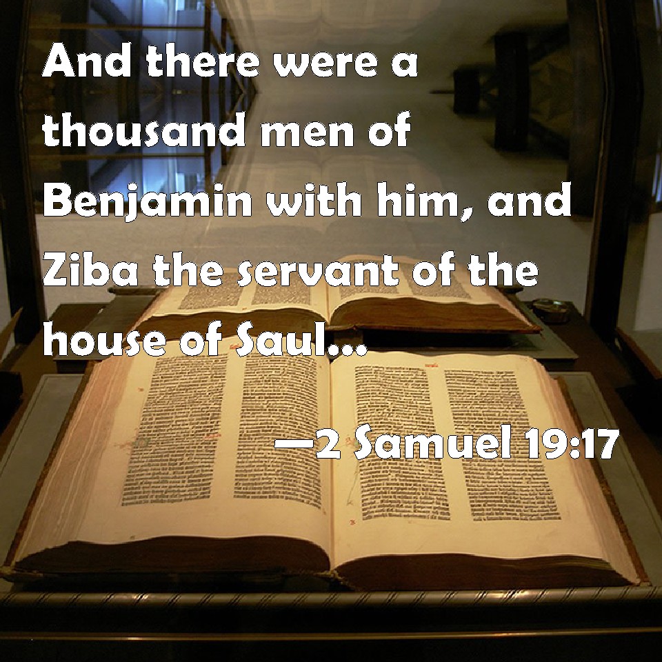 Choose a Background 2 Samuel 19:17 And there were a thousand men of Benjamin with him, and Ziba the servant of the house of Saul, and his fifteen sons and his twenty servants with him; and they went over Jordan before the king. KJV: And there were a thousand men of Benjamin with him, and Ziba the servant of the house of Saul, and his fifteen sons and his twenty servants with him; and they went over Jordan before the king. DRB: With a thousand men of Benjamin, and Siba the servant of the house of Saul: and his fifteen sons, and twenty servants were with him: and going over the Jordan, DBT: And there were a thousand men of Benjamin with him, and Ziba the servant of the house of Saul, and his fifteen sons and his twenty servants with him; and they forded the Jordan before the king. ERV: And there were a thousand men of Benjamin with him, and Ziba the servant of the house of Saul, and his fifteen sons and his twenty servants with him; and they went through Jordan in the presence of the king. WBT: And there were a thousand men of Benjamin with him, and Ziba the servant of the house of Saul, and his fifteen sons and his twenty servants with him; and they went over Jordan before the king. WEB: There were a thousand men of Benjamin with him, and Ziba the servant of the house of Saul, and his fifteen sons and his twenty servants with him; and they went through the Jordan in the presence of the king. YLT: and a thousand men are with him from Benjamin, and Ziba servant of the house of Saul, and his fifteen sons and his twenty servants with him, and they have gone prosperously over the Jordan before the king.Links 2 Samuel 19:17 NIV • 2 Samuel 19:17 NLT • 2 Samuel 19:17 ESV • 2 Samuel 19:17 NASB • 2 Samuel 19:17 KJV • 2 Samuel 19:17 Interlinear • 2 Samuel 19:17 Commentaries • 2 Samuel 19:17 Parallel Texts • 2 Samuel 19:17 Bible Apps • 2 Samuel 19:17 Parallel • Bible Hub |